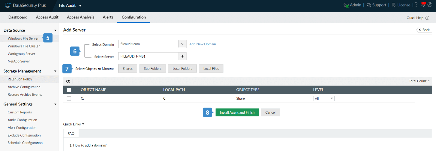 Pasos para configurar DataSecurity Plus para supervisar accesos a archivos