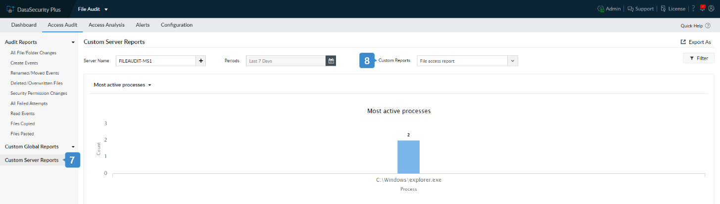 Bajo la pestaña Auditoría de archivos, vaya a Auditoría de accesos y genere el informe Todos los cambios en archivos/carpetas para obtener detalles sobre el quién, cuándo y dónde de todos los cambios hechos a los archivos. Para ver todos los accesos de lectura hechos al archivo, vaya a Auditoría de accesos bajo la pestaña Auditoría de archivos y genere el informe Eventos de lectura. Aquí para ver los datos de un archivo específico.