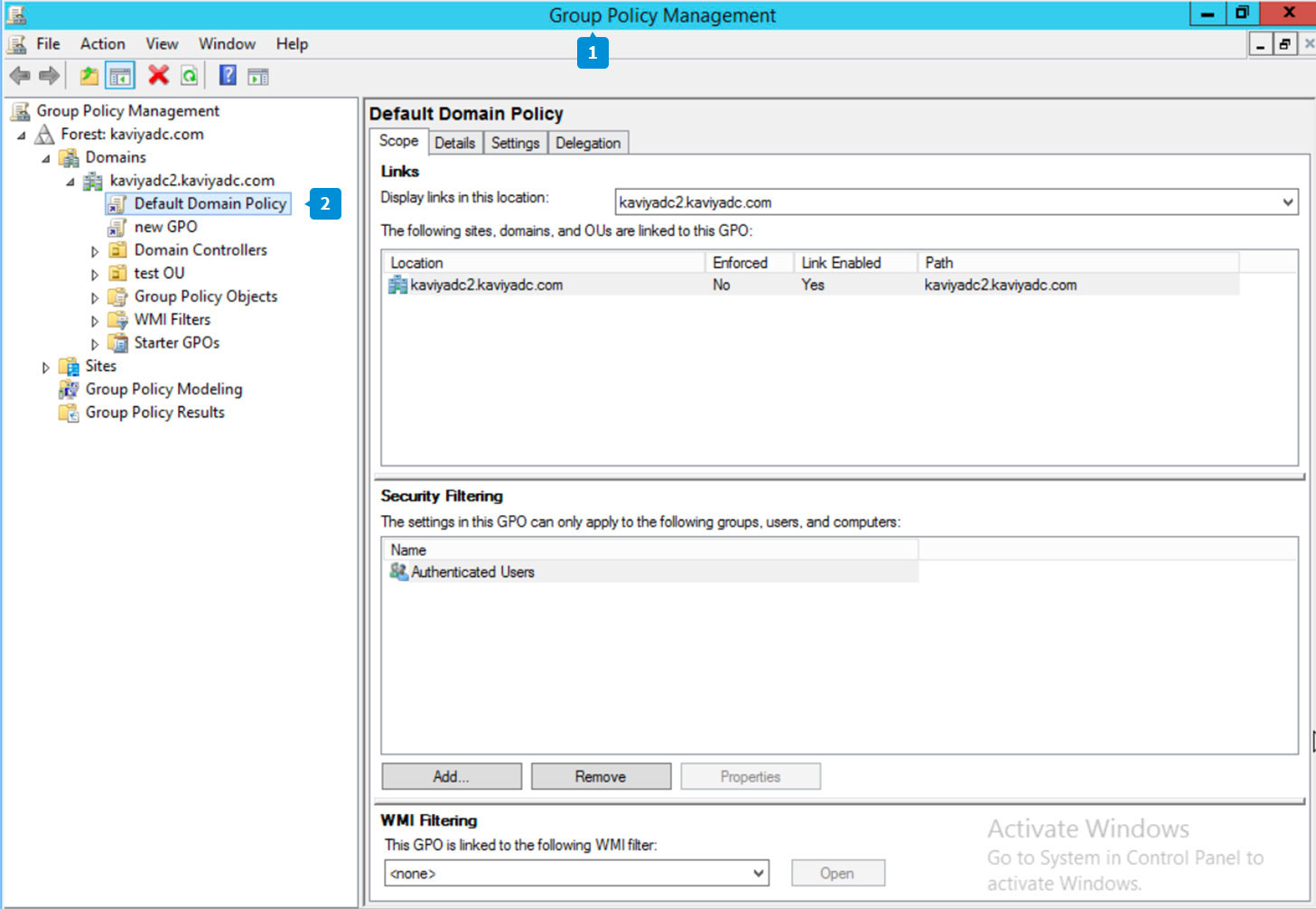 - Se abrirá la ventana Consola de gestión de políticas de grupos. Se puede crear un nuevo Objeto de políticas de grupos (GPO) o se puede modificar uno existente.