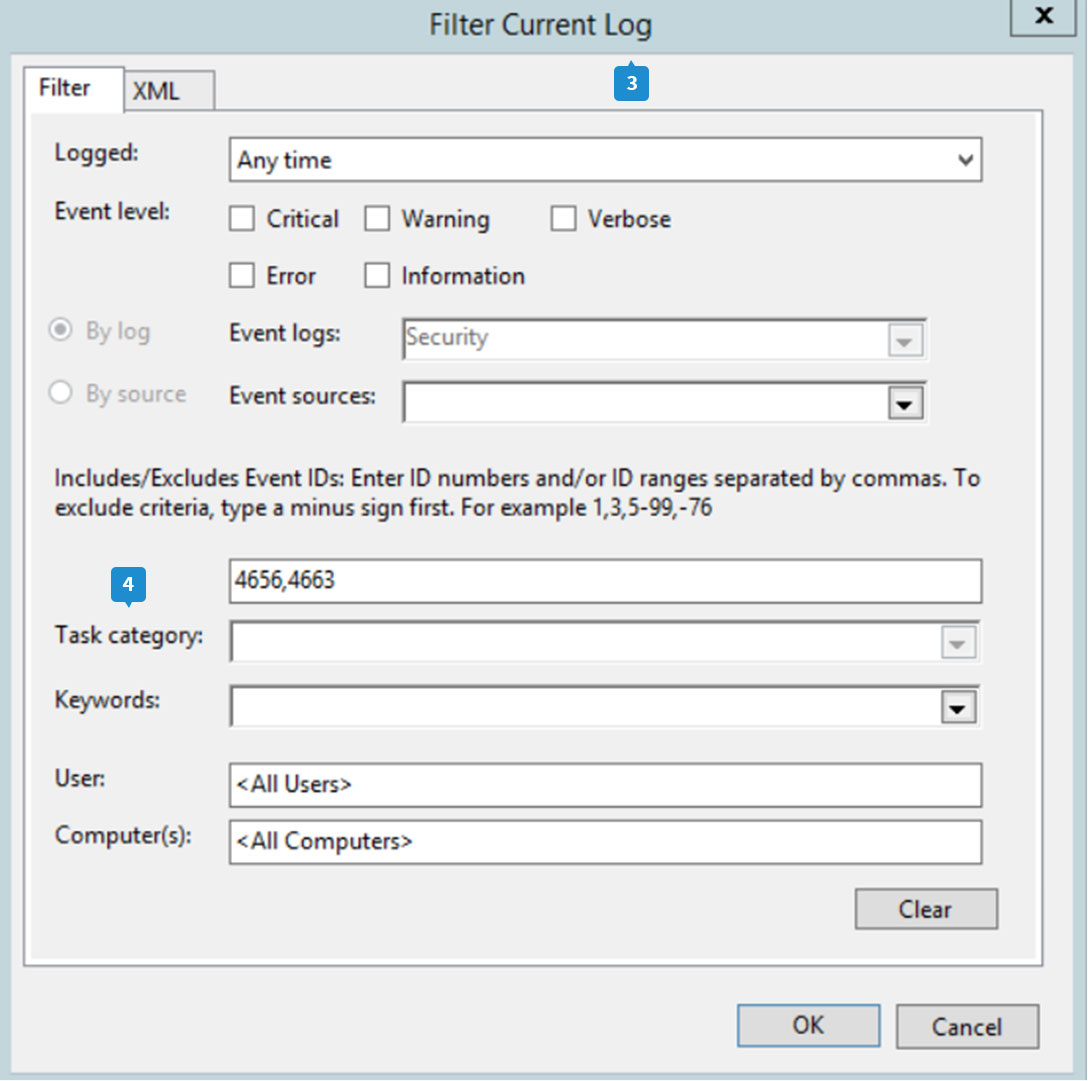 - Bajo la opción Categoría de tareas, ingrese la ID del evento del que desea ver los logs. Cuando se accede a un archivo, se registran las ID de eventos 4656 y 4663.