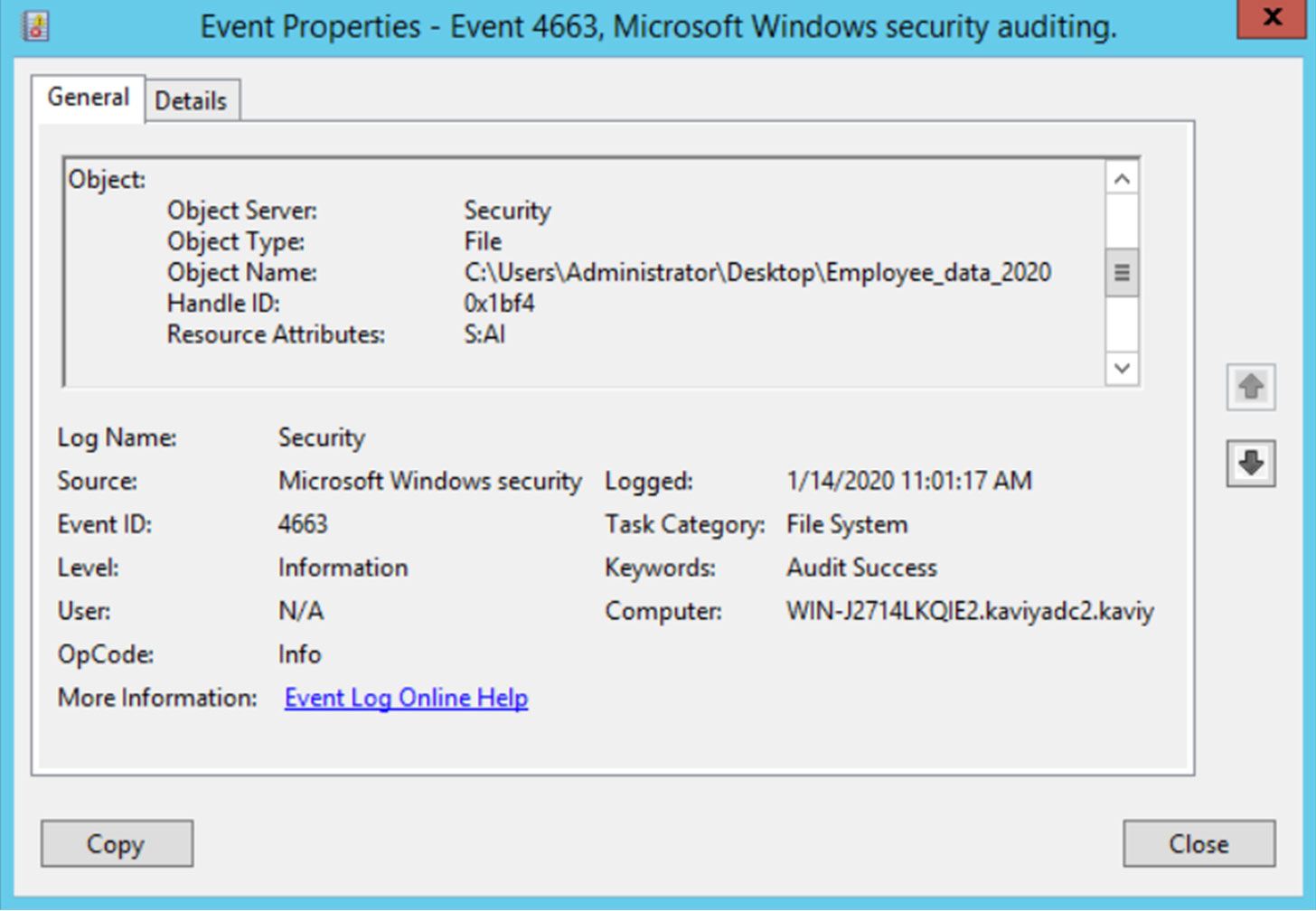 Ahora, ha configurado exitosamente DataSecurity Plus para descubrir todos los accesos al archivo requerido. La entrada con el sello de tiempo más reciente muestra quién fue el último en acceder al archivo.