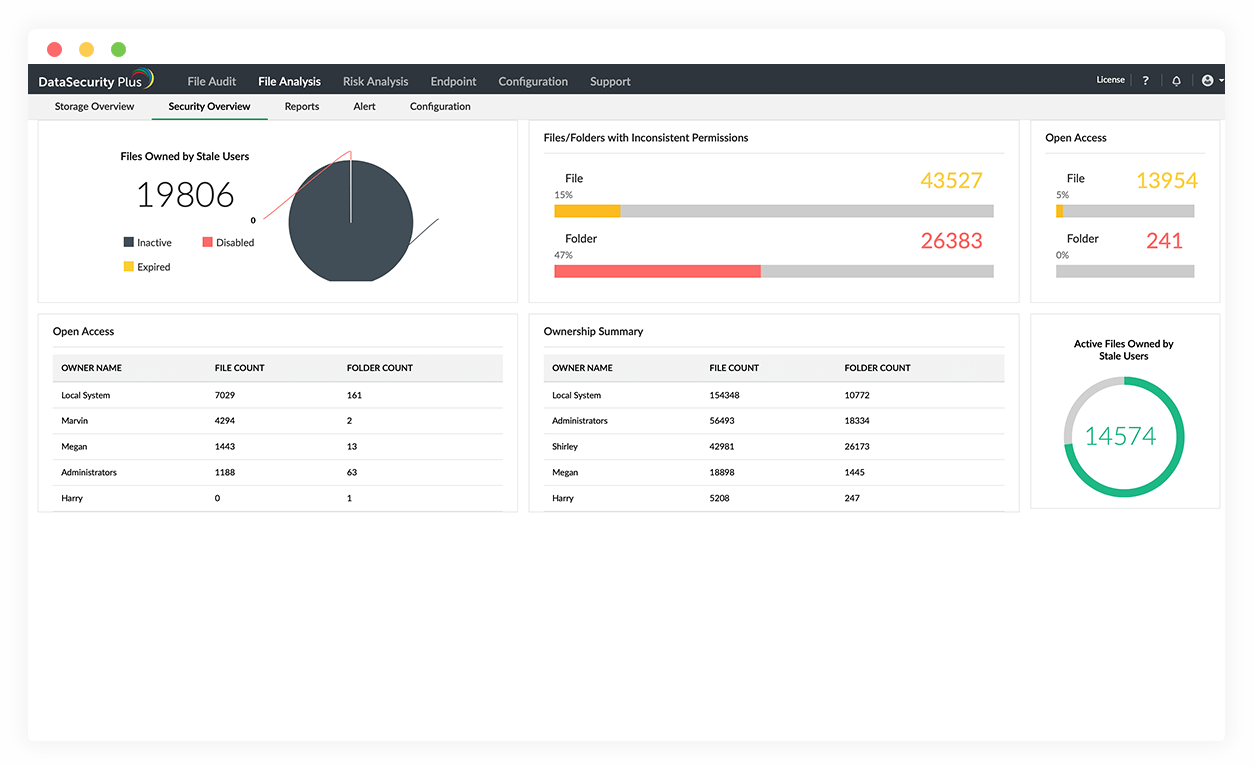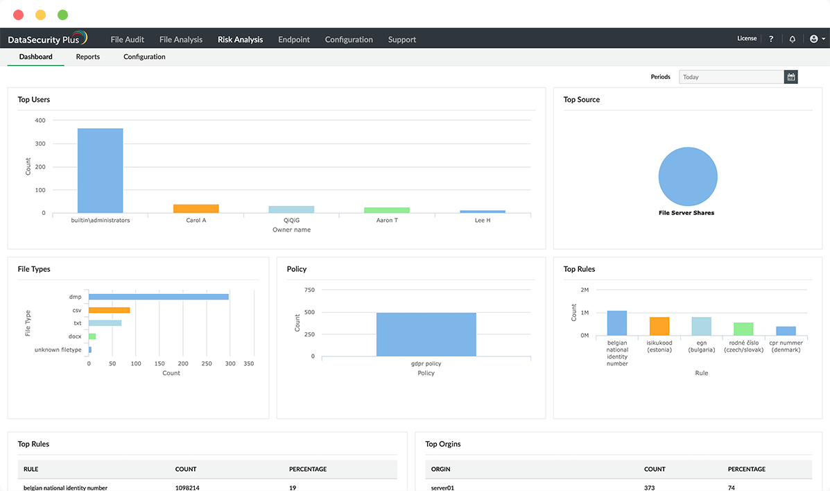Obtenga visibilidad de las prácticas de acceso y almacenamiento de datos con una plataforma integral para auditoría de archivos, análisis de archivos, detección de datos y prevención de pérdida de datos (DLP).