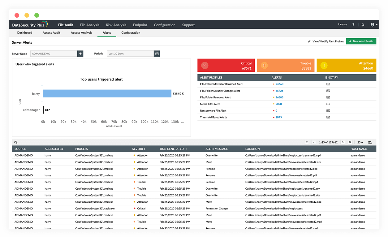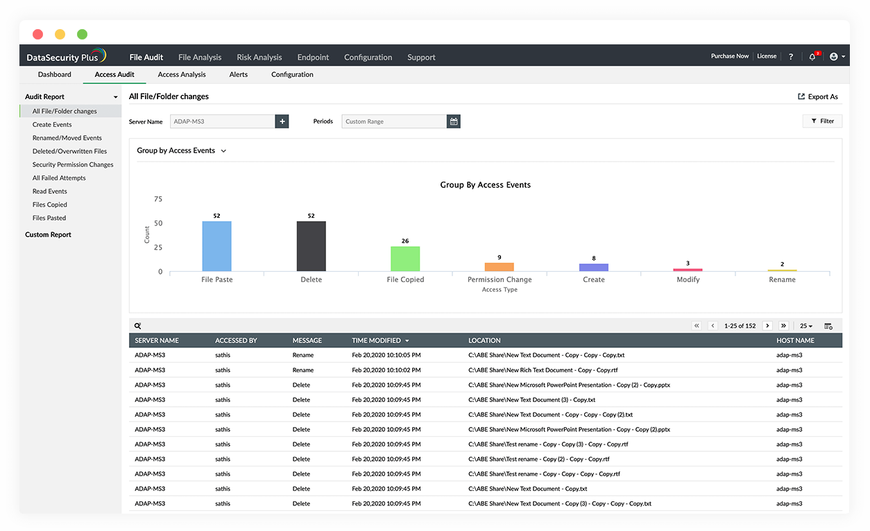 Reporte los accesos a archivos fuera de lo común, cambios y acciones de copiar-pegar en tiempo real, y cree informes personalizados para centrarse en actividades críticas.