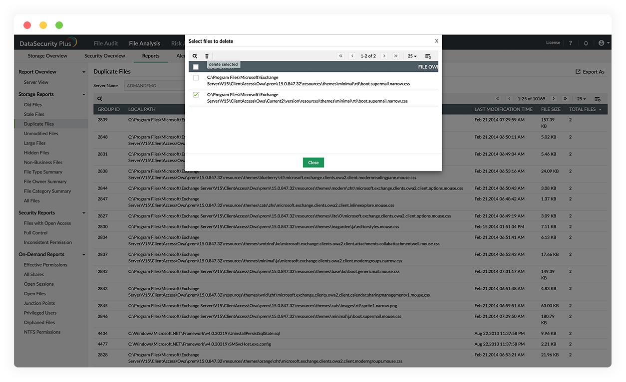 Reciba informes sobre los archivos con múltiples copias, con información sobre el número de duplicados y sus ubicaciones. Elimine las copias innecesarias y ordene su almacenamiento.