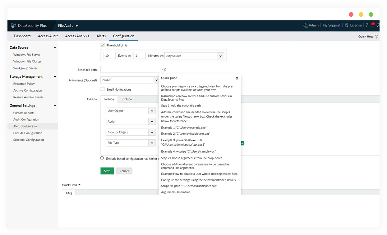 Detecte y responda a picos súbitos en accesos a archivos o modificaciones anómalas a archivos usando alertas en tiempo real y un mecanismo de respuesta automatizada.