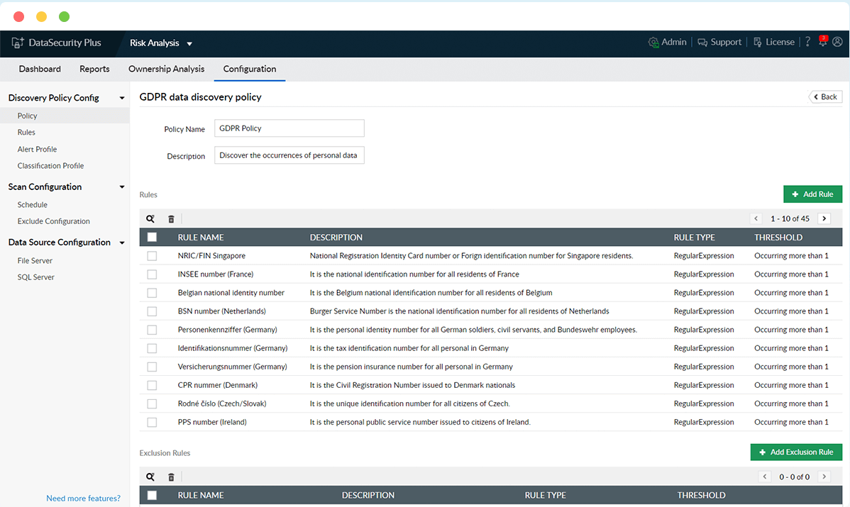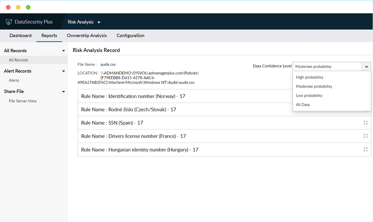 Localice datos confidenciales y PII en servidores de archivos Windows, failover clusters y bases de datos MSSQL, y obtenga informes detallados en una consola unificada.