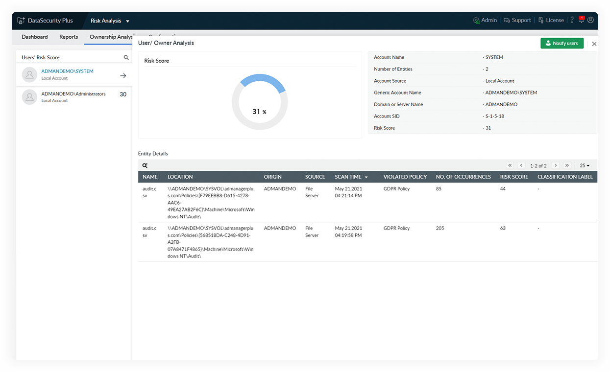 Localice y mantenga registros de los datos de riesgo para protegerlos de la exposición. Vea los niveles de riesgo de los archivos con nuestro sistema de puntuación de riesgo incorporado y localice las violaciones con falsos positivos mínimos.