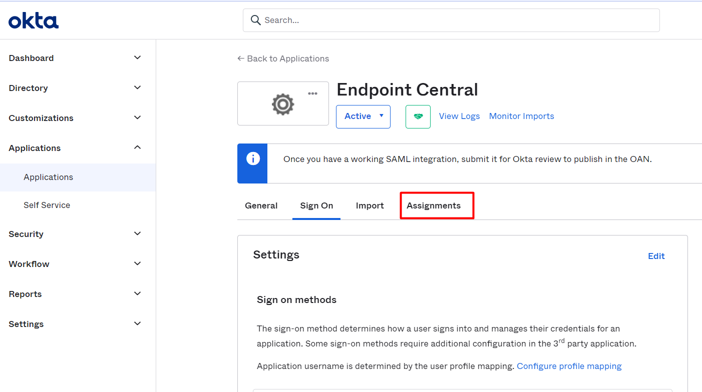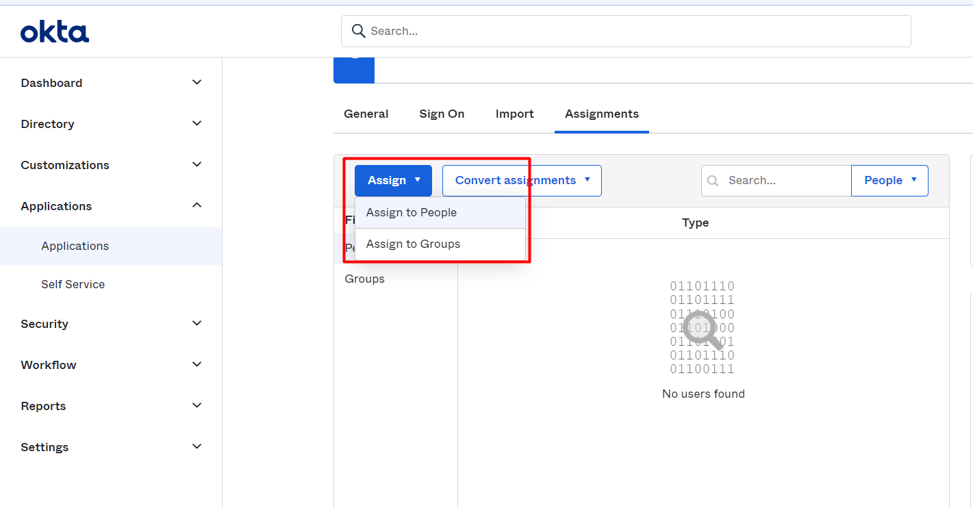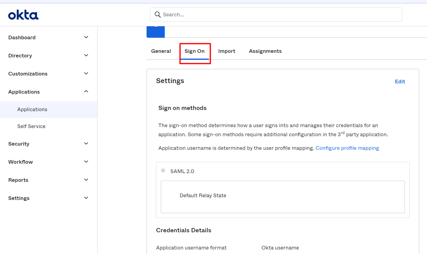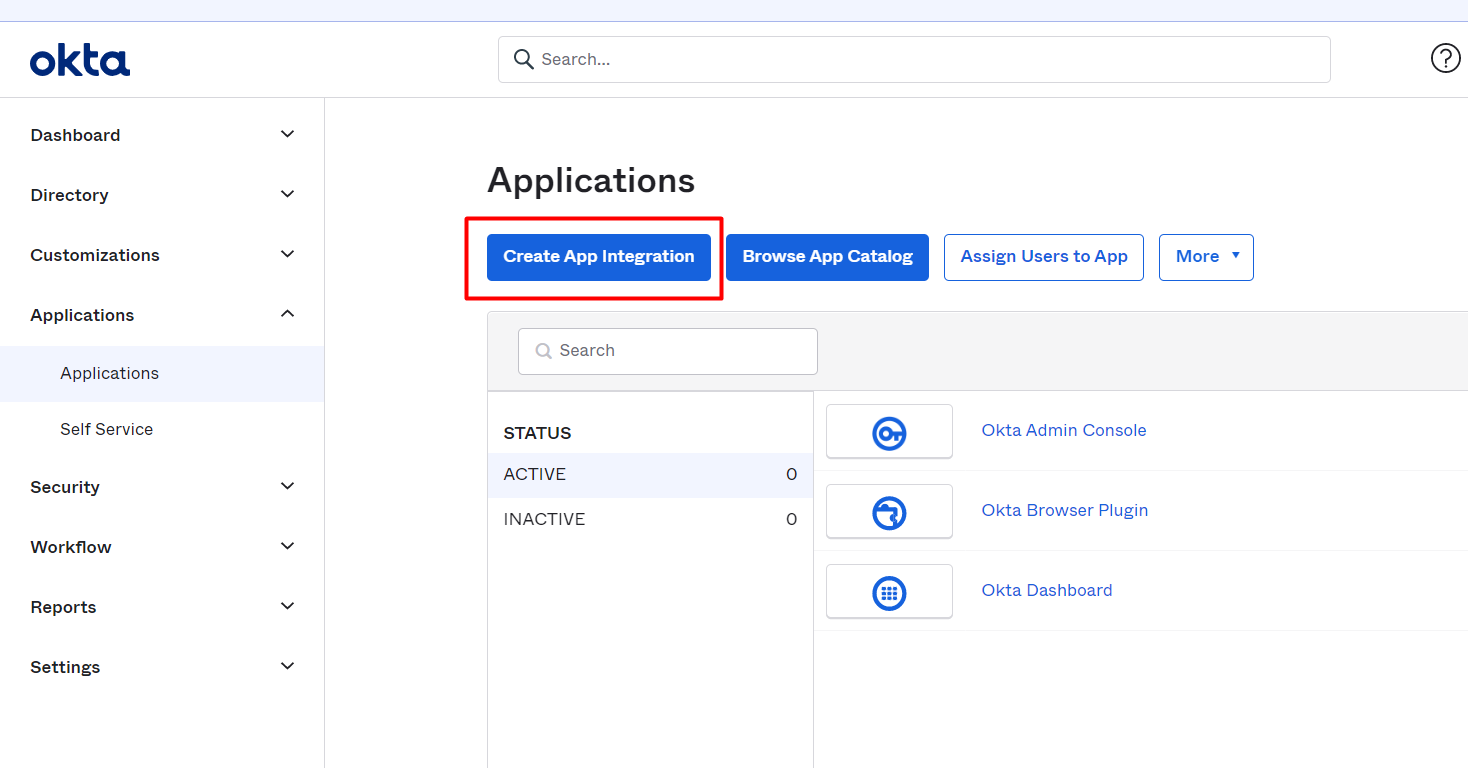 - Inicie sesión en Okta. Haga clic en la pestaña de administración. Navegar a Aplicaciones.