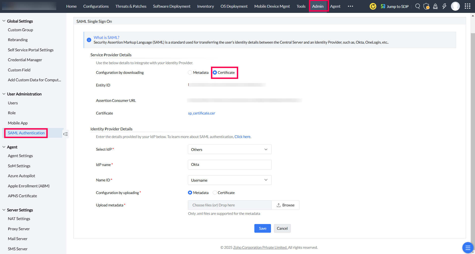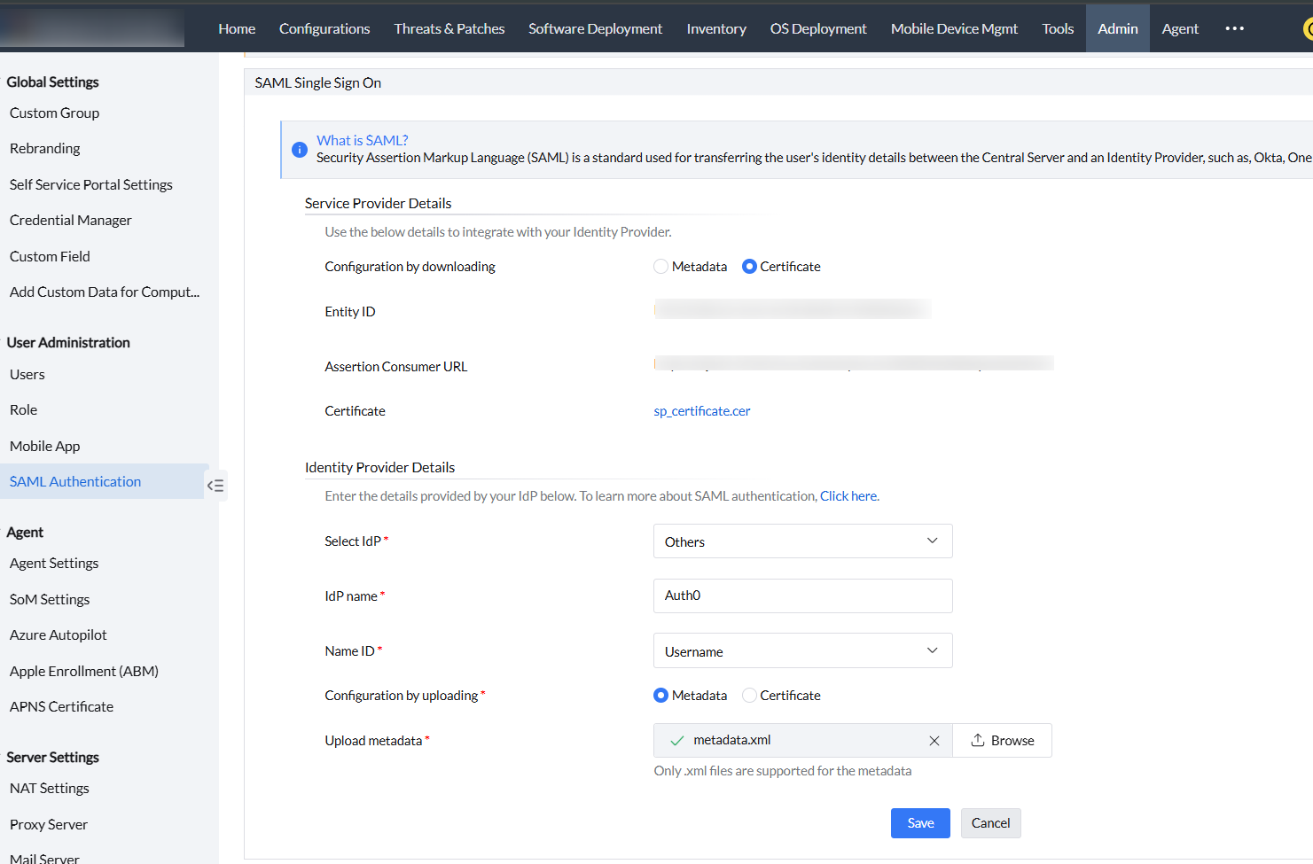 - En el servidor central, vaya a la pestaña Administración, seleccione Autenticación SAML. Elija Configuración descargando el certificado. Copiar el ID de la entidad y la URL del consumidor de la afirmación.