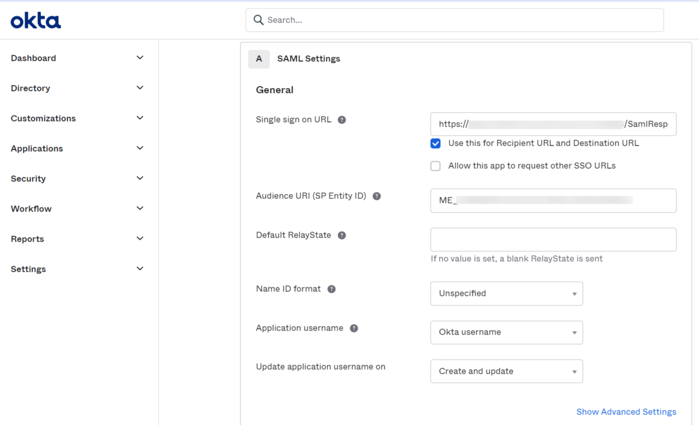 - En Okta, pegue la URL del consumidor de Aserción contra la URL de inicio de sesión único. Pegue el ID de la entidad contra el URI de la audiencia (SP ID de la entidad).