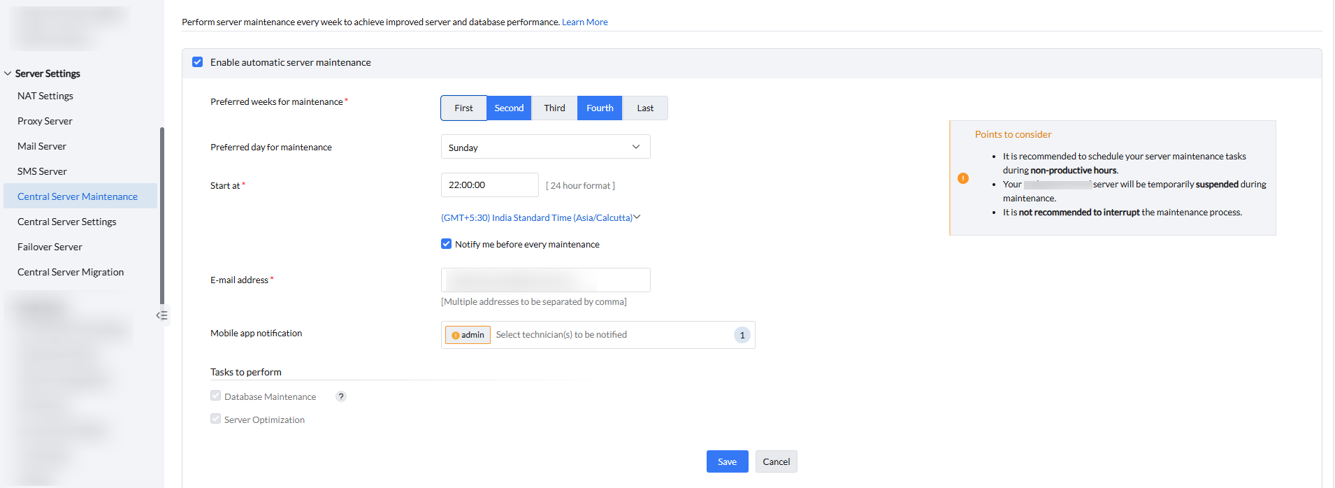 - Habilite el mantenimiento automatizado del servidor y programe las semanas, el día y la hora que prefiera para comenzar el mantenimiento. Una vez proporcionados todos los detalles, la tarea de mantenimiento se programará correctamente, como se muestra en la imagen a continuación.