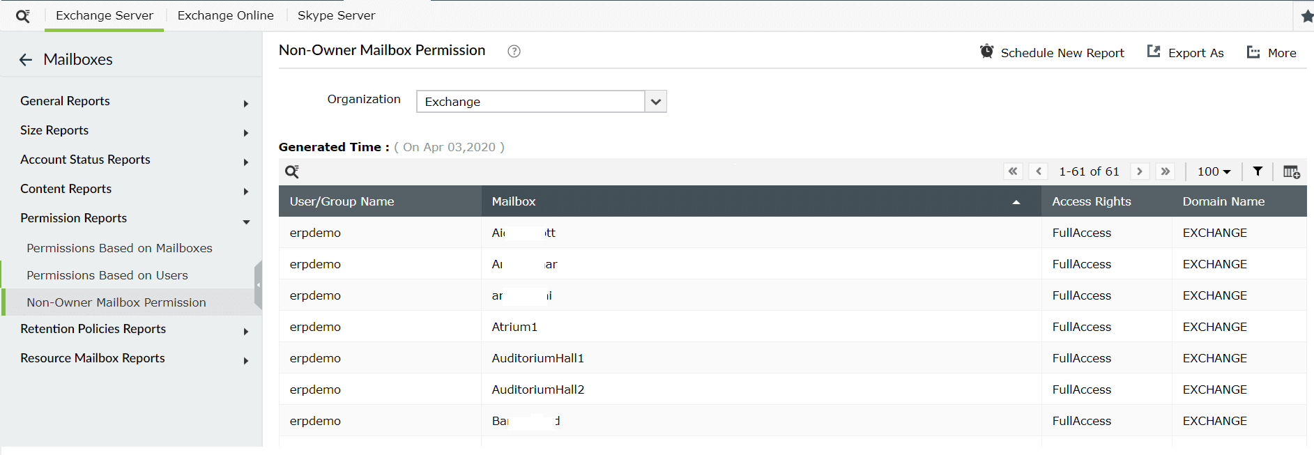 Por suerte, Exchange Reporter Plus le puede ayudar con esto. Vea los derechos de acceso (acceso total, enviar como, eliminar elemento, leer, cambiar propietario o cuenta externa) que tienen los empleados sobre los buzones compartidos, hasta las carpetas individuales, mediante esta completa solución de informes, auditoría de cambios y monitoreo.