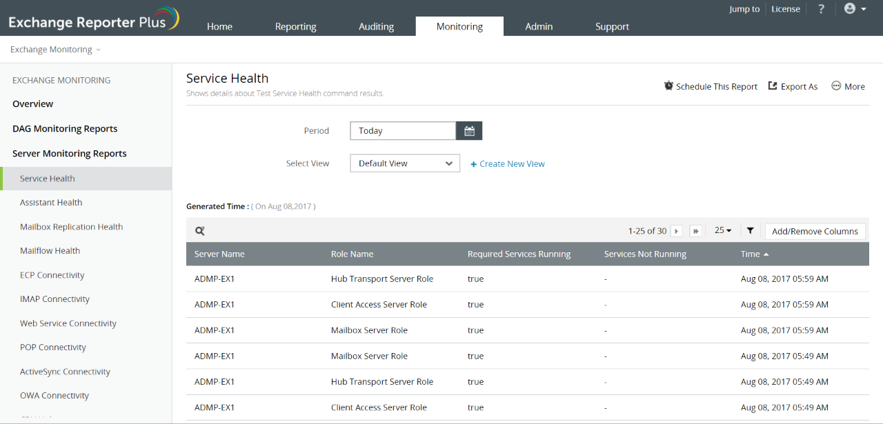 Depender de PowerShell para recopilar información de sus servicios de Exchange resulta lento y demasiado complejo. En su lugar, utilice Exchange Reporter Plus para controlar los servicios de Exchange, ¡ya que proporciona informes detallados y le permite configurar alertas!