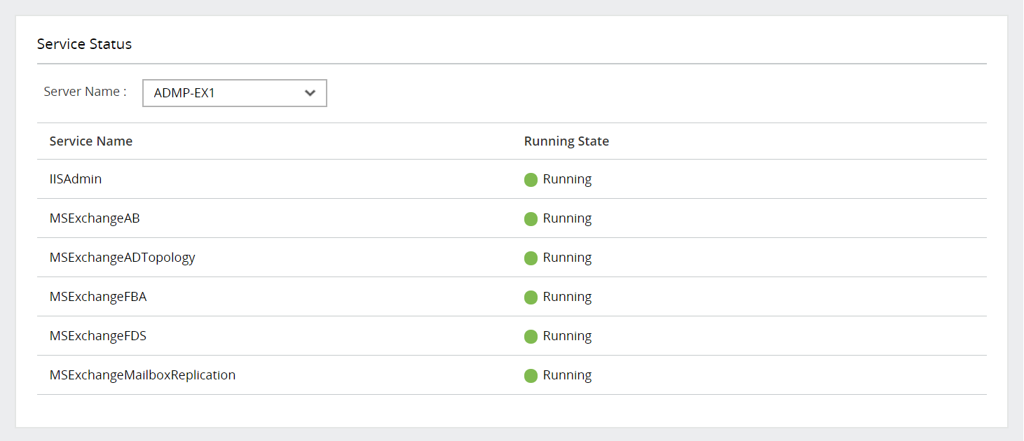 Utilice los informes detallados de Exchange Reporter Plus para garantizar que todos los servicios que necesita Exchange se estén ejecutando. Identifique fácilmente el nombre del servidor, su rol y si los servicios necesarios se están ejecutando o no. Obtenga un resumen rápido del estado de ejecución de todos los servicios de Exchange a través del dashboard intuitivo de esta solución.