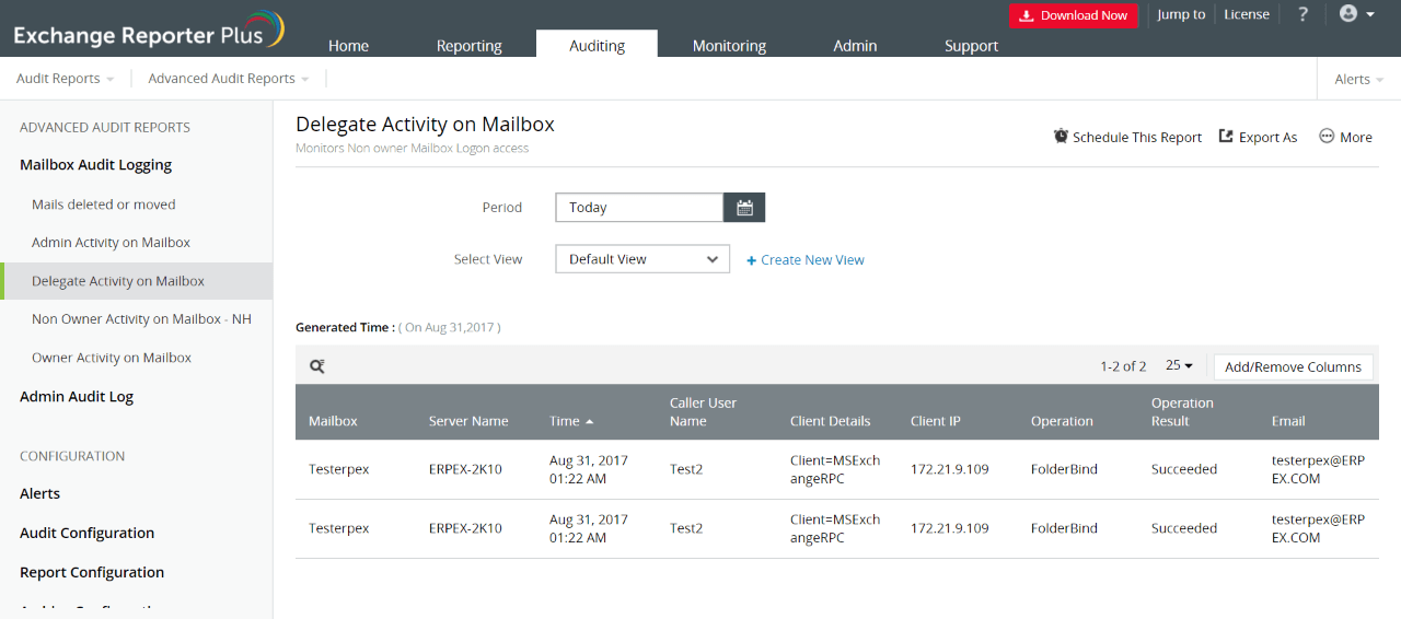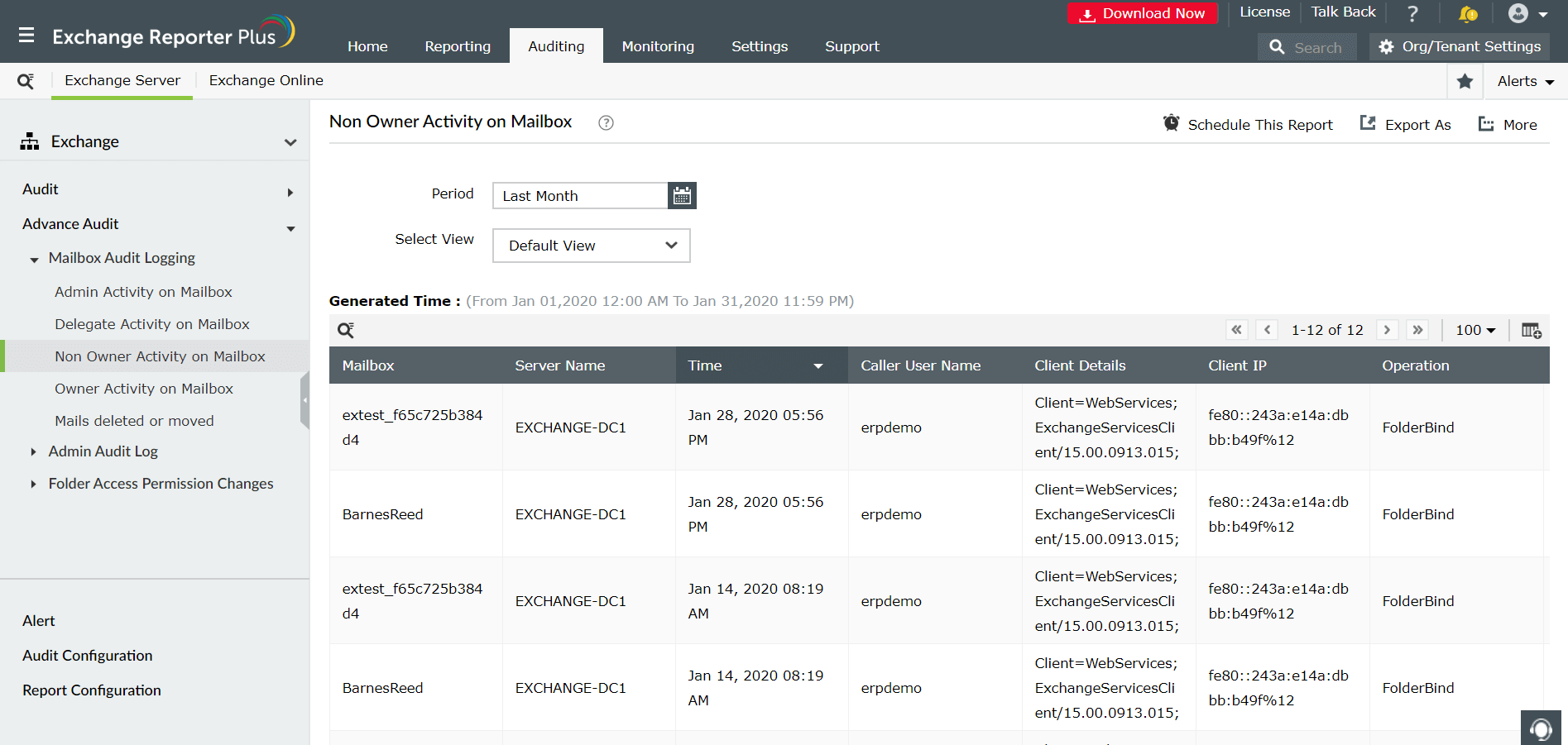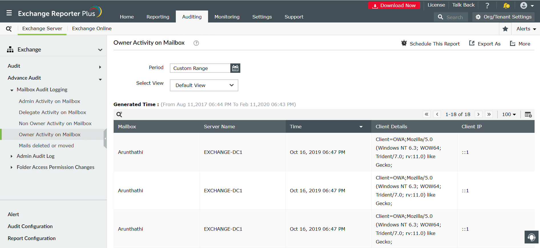 En Exchange Reporter Plus, vaya a Auditoría → Auditoría avanzada → Registro de auditoría del buzón para obtener estos informes de auditoría del buzón de correo e informes sobre los registros de acceso al buzón de Exchange.