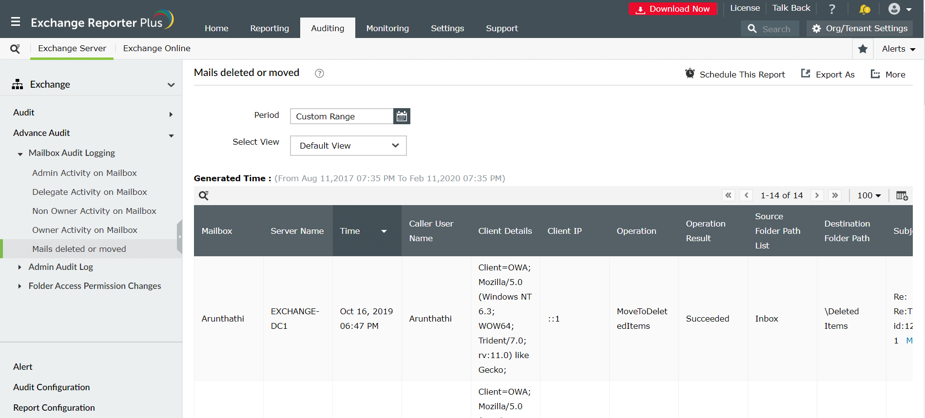 Obtenga detalles completos sobre los correos electrónicos que se han eliminado o movido a diferentes carpetas en los buzones de Exchange con nuestro informe de logs de auditoría de Exchange. Los logs del buzón de Exchange muestran el nombre del buzón de correo y del servidor, el usuario que eliminó o movió un correo electrónico, la dirección IP del cliente, las carpetas de origen y destino, y mucho más. Con el registro de auditoría del buzón de correo, descubra las operaciones realizadas dentro de los buzones, como si se accedió a una carpeta, se creó un elemento o se copió en otra carpeta, se eliminaron objetos de buzones de correo electrónico o no, y más.