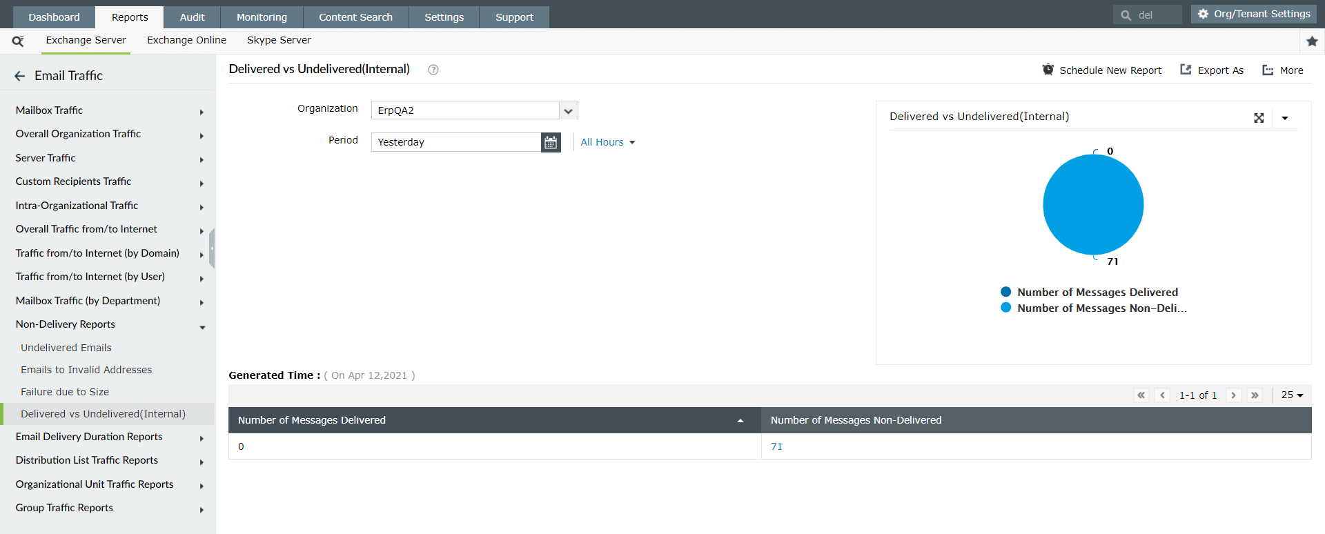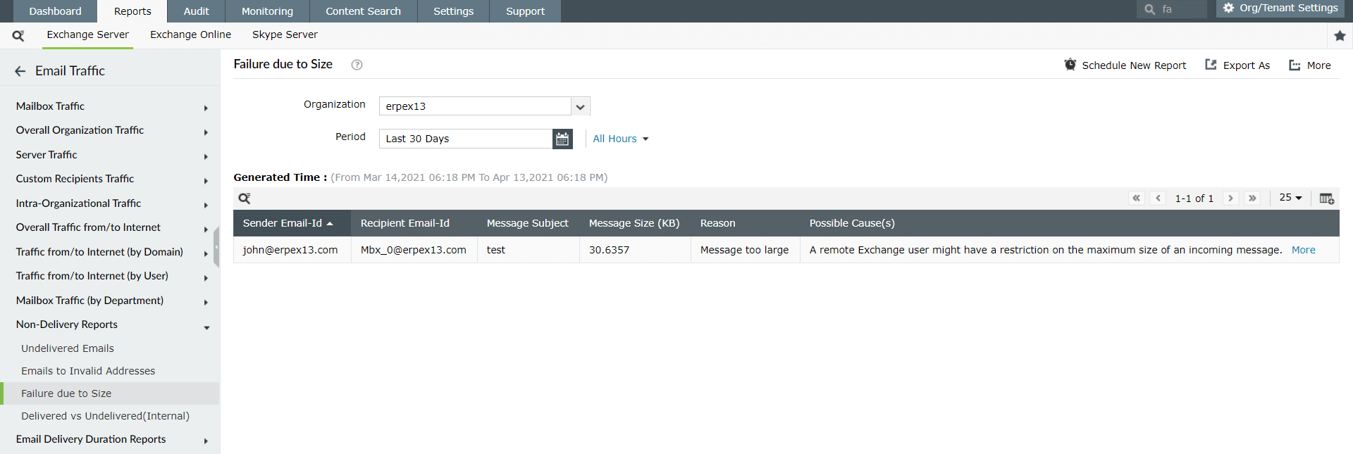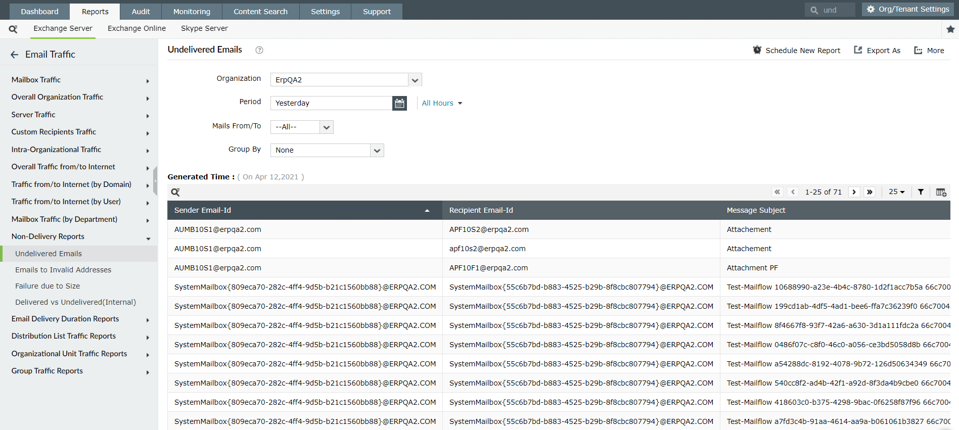 Aquí es donde Exchange Reporter Plus resulta útil y ofrece los "Informes de correo electrónico no entregado", que están destinados a mantener un seguimiento de los correos electrónicos que no han sido recibidos por el buzón de destino. Esta categoría de informes consta de cuatro informes: