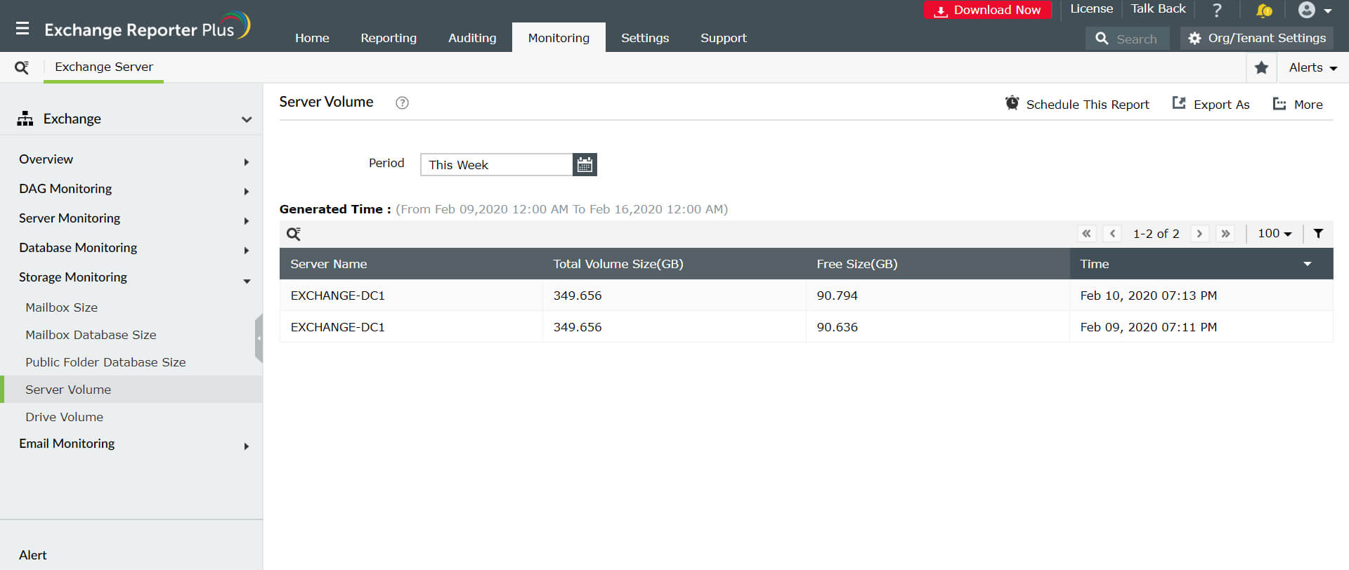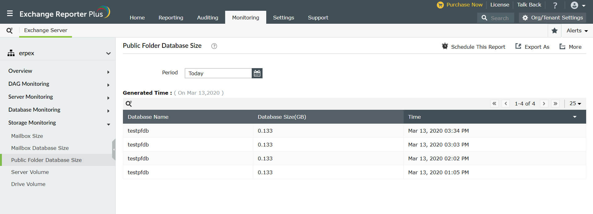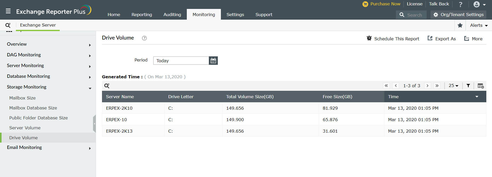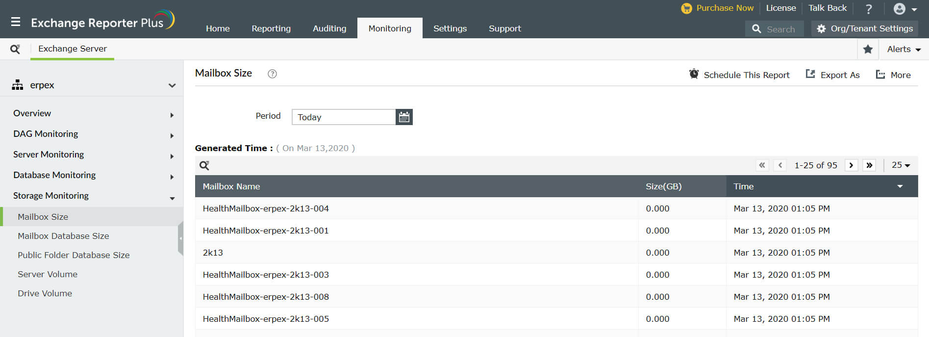 Exchange Reporter Plus es una completa herramienta de auditoría de cambios, monitoreo y generación de informes de Exchange que le ayuda a monitorear el tamaño de almacenamiento de los buzones de correo, las bases de datos, las carpetas públicas, las unidades y otros componentes de MS Exchange Server. Proporciona informes de monitoreo de almacenamiento para plataformas de Exchange Server 2003, 2007, 2010, 2013, 2016 y 2019.
