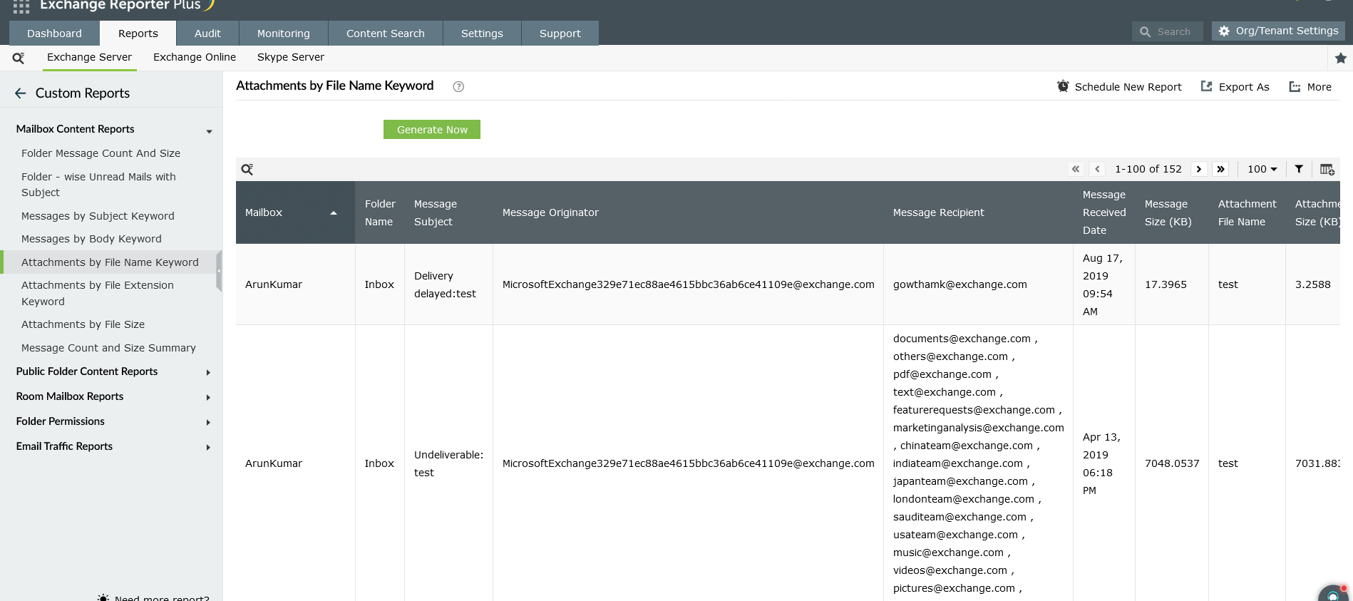 Obtenga estadísticas detalladas sobre los archivos adjuntos en los mensajes filtrándolos en función de su tamaño. Con este informe de buzones de Exchange, usted puede localizar fácilmente los archivos que están consumiendo demasiado espacio en sus entornos de Exchange Server y Exchange Online.