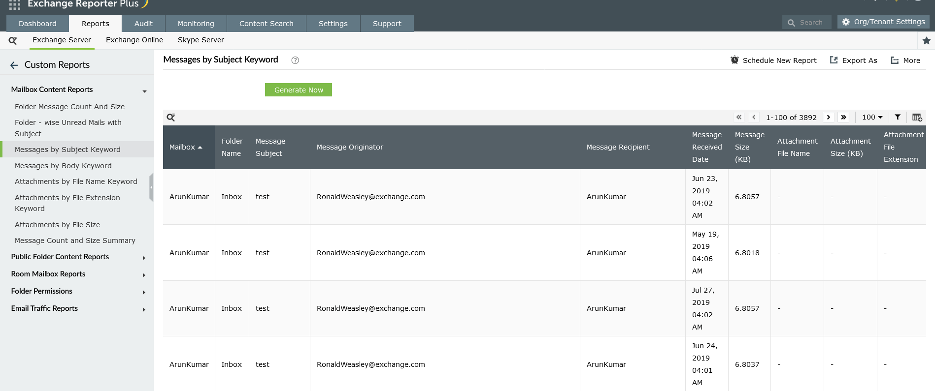 Encuentre todos los mensajes de su organización que tengan una palabra clave concreta en el cuerpo del correo electrónico con este informe de contenido del buzón de Exchange. Utilice este informe para profundizar en la lucha contra el spam y mantener limpios sus buzones de correo.