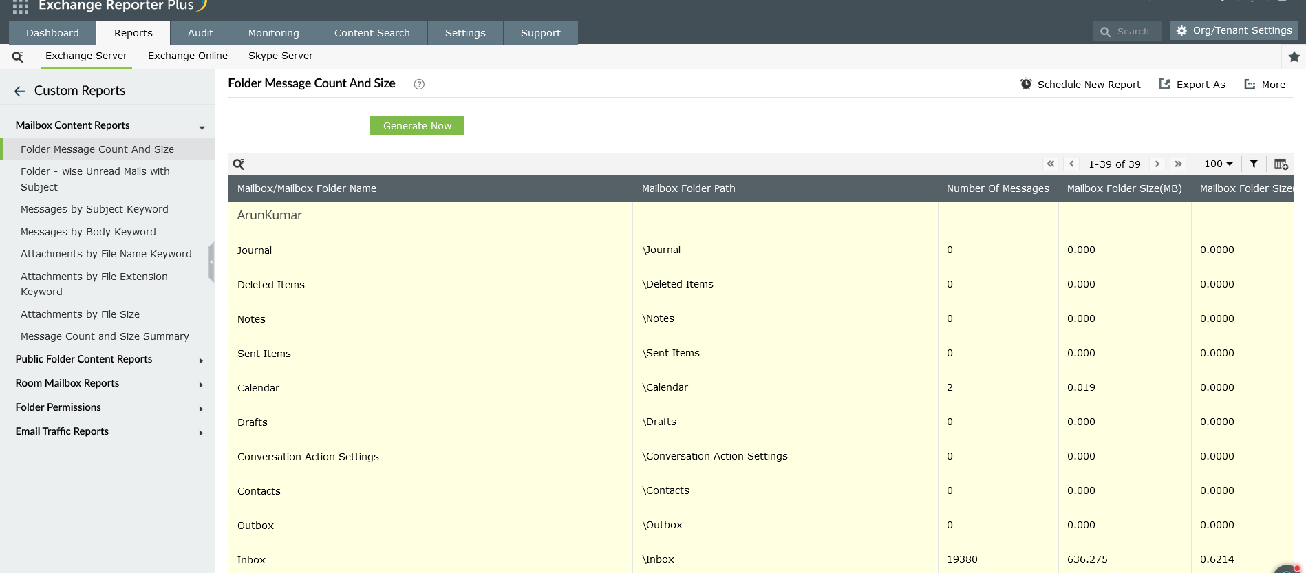 Encuentre el número de mensajes y el espacio utilizado en cada buzón de Exchange y Microsoft 365 de su organización, buzón por buzón, mediante este informe de buzones de Exchange. Con este rápido resumen general de las carpetas de los buzones de correo, incluida la ruta de cada carpeta, la resolución de problemas en el entorno de Exchange se realiza fácilmente.