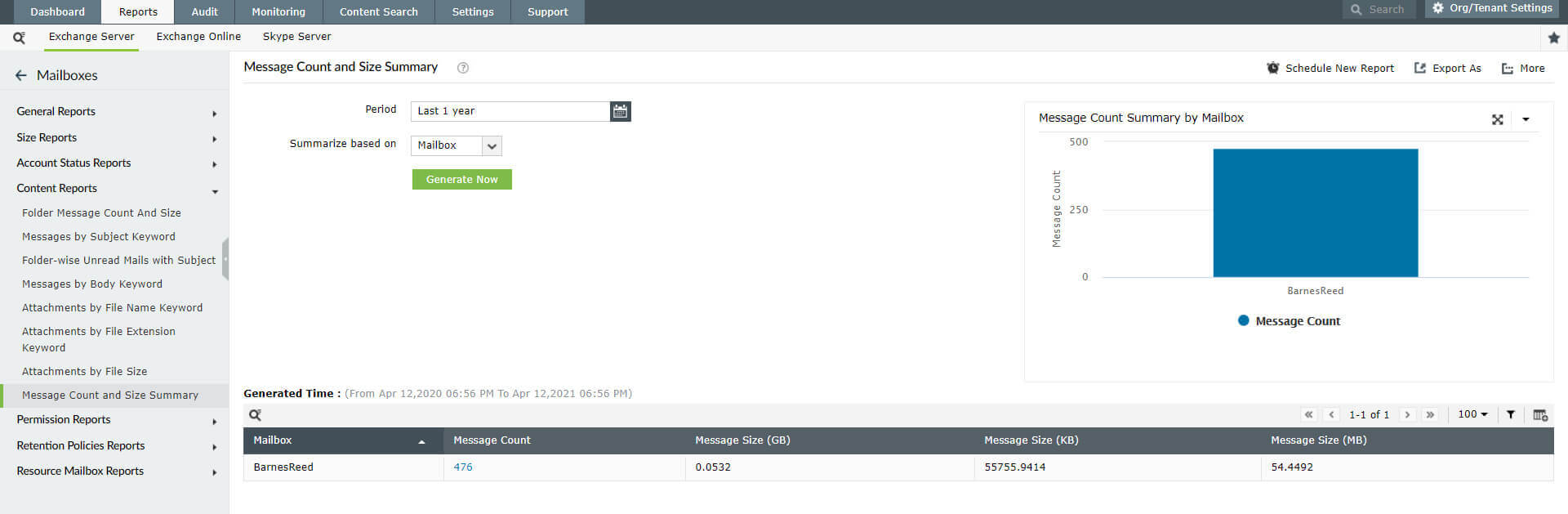 Los informes de contenido del buzón pueden generarse, filtrarse y monitorearse en función de: