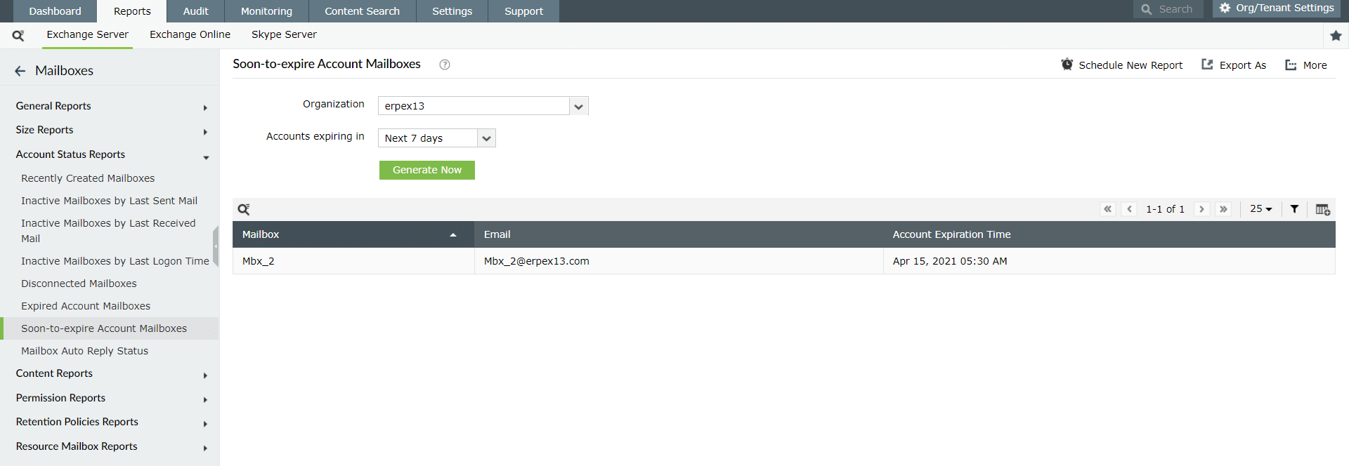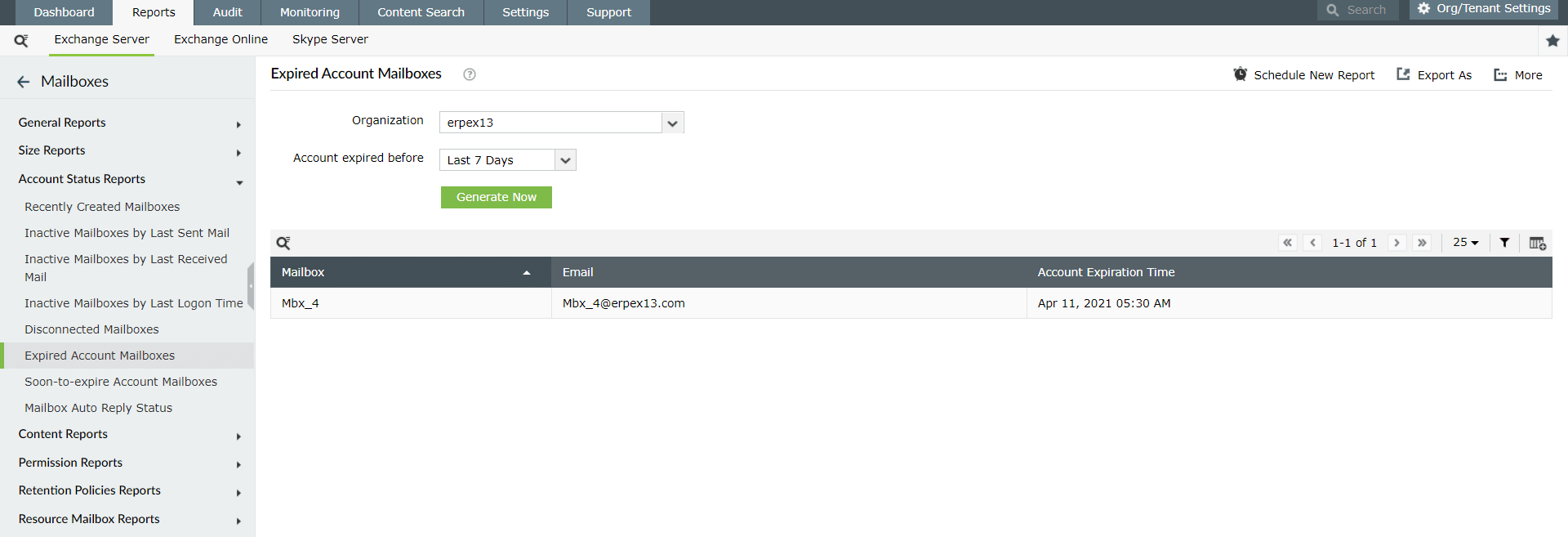El informe de buzones de cuentas caducadas permite controlar los buzones obsoletos con un solo clic. Este informe genera una lista de las cuentas que han caducado en los últimos "n" días junto con detalles como la hora de caducidad de la cuenta.