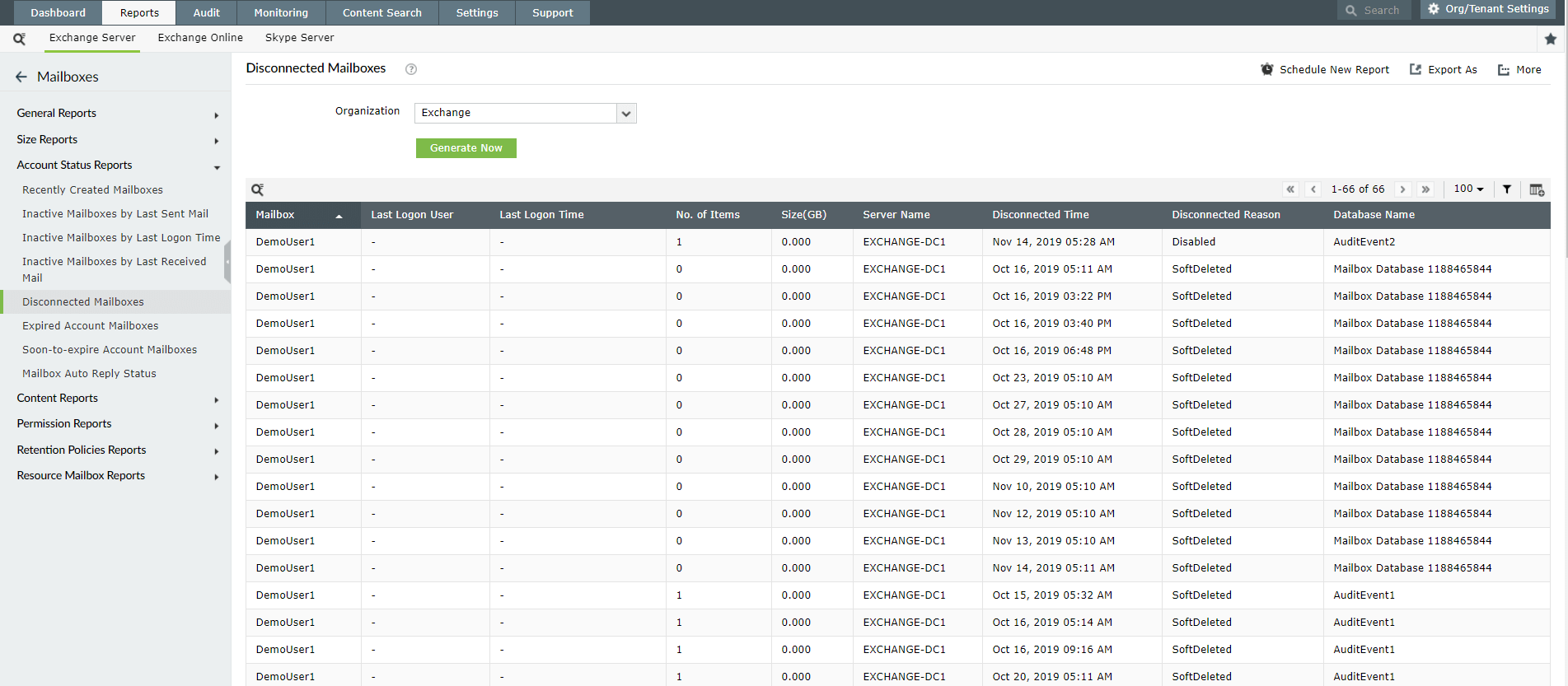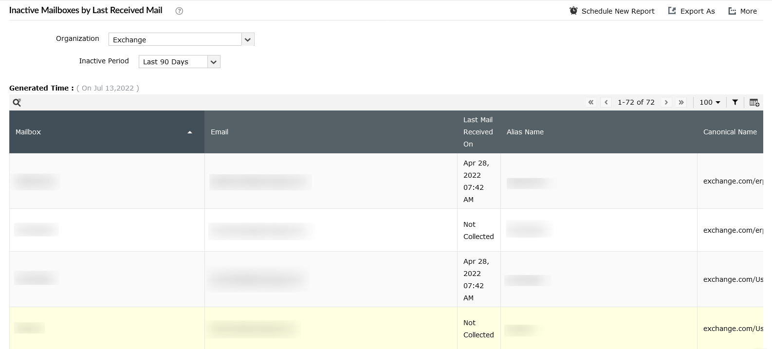 Descubra todos los buzones de correo obsoletos de su organización mediante este informe. Además de la hora de recepción de los correos electrónicos, este informe también muestra detalles como los nombres de los buzones, servidores y bases de datos de buzones involucrados. Este informe le resultará útil durante las auditorías internas de licencias, cuando desee liberar licencias de buzones inactivos.