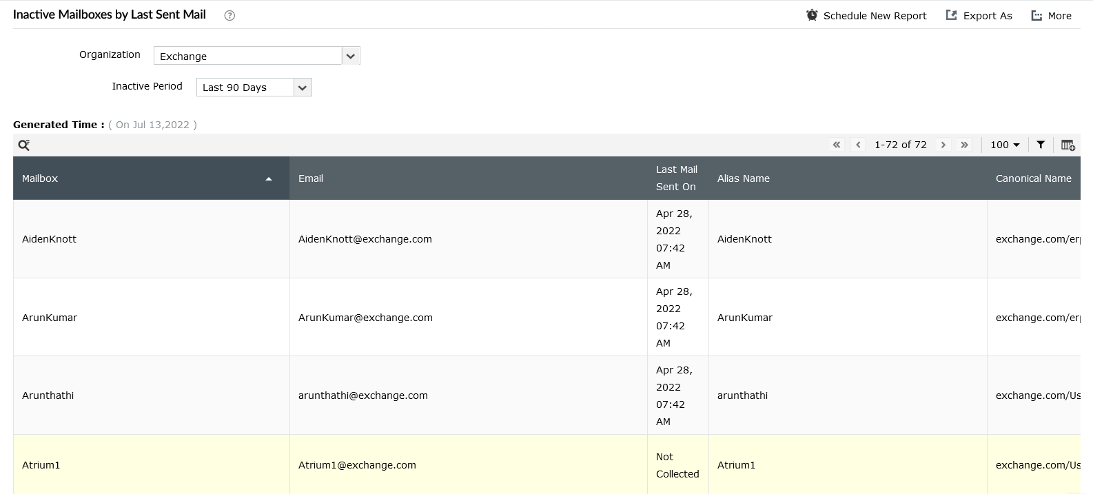 Este informe tiene la misma finalidad que el anterior, pero desde la perspectiva del receptor. Este informe utiliza el valor de la última marca de tiempo de inicio de sesión y enumera los buzones a los que no se ha accedido en absoluto o que no se han utilizado durante el periodo de tiempo especificado de "n" días.