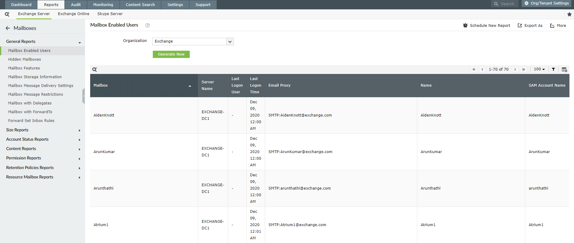 Se trata de un informe para conocer todos los usuarios que tienen habilitado el buzón de correo. Un administrador puede utilizar este informe para obtener la información básica sobre los usuarios habilitados para el buzón de Exchange y comprobar su última hora de inicio de sesión, último usuario que inició sesión, nombre de alias, etc.