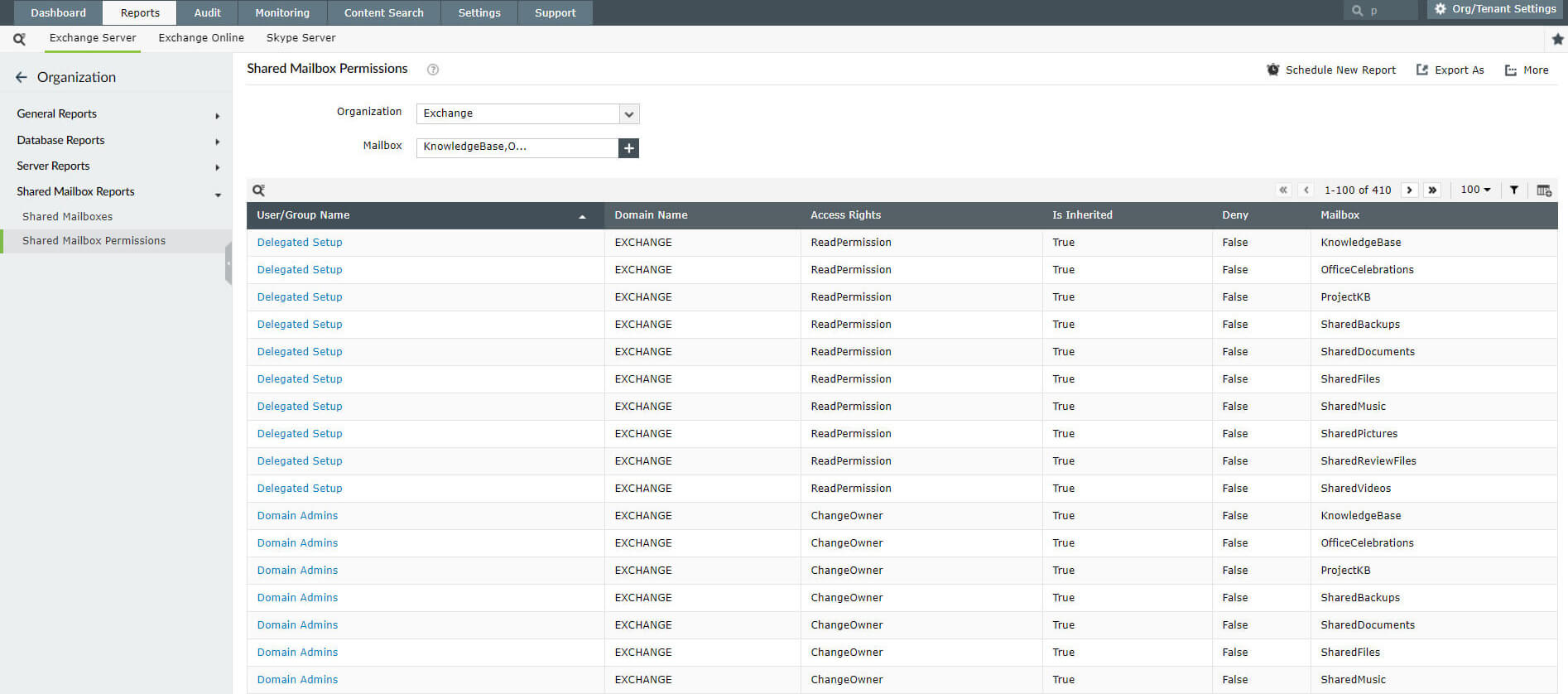 En la mayoría de las empresas, un gran número de usuarios tiene acceso a buzones compartidos. A medida que la empresa se expande, muchos usuarios heredan involuntariamente el acceso a estos buzones compartidos. Exchange Reporter Plus le permite realizar un control de los permisos (heredados o asignados) que los usuarios y grupos tienen sobre determinados buzones compartidos.