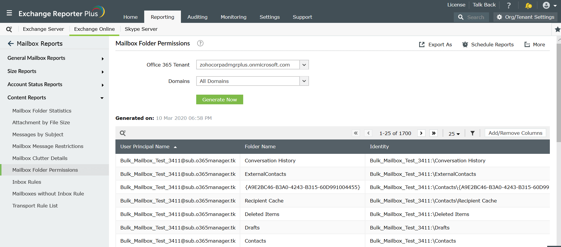 Además de los informes de permisos de buzones de Exchange Server, Exchange Reporter Plus también ofrece un conjunto de informes sobre permisos de carpetas públicas, permisos de listas de distribución, permisos de buzones compartidos y permisos de calendario tanto para Exchange Server como para Exchange Online. Exchange Reporter Plus es compatible con Exchange Server 2003, 2007, 2010, 2013, 2016 y 2019; Exchange Online; y Skype for Business. Usted puede exportar estos informes de permisos de buzón de Exchange como PDF, CSV, HTML y XLS. Además, programe estos informes para que se generen automáticamente y se envíen a las partes interesadas de su organización por correo electrónico.