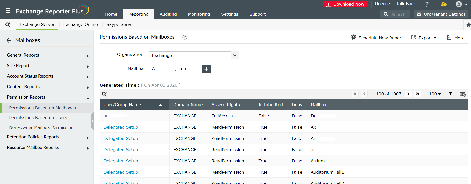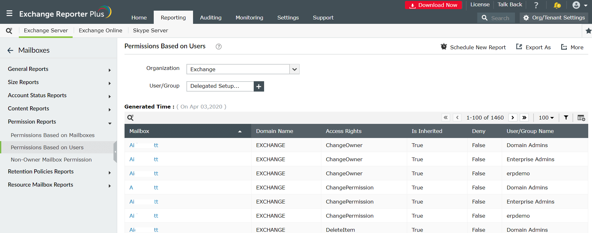 Asignar permisos excesivos a los delegados puede resultar desastroso para los datos sensibles contenidos en el buzón del usuario. Para monitorear efectivamente los buzones de correo con delegados, usted puede programar y generar este informe de permisos de Exchange Server. Exchange Reporter Plus ofrece este informe para Exchange Server 2003, 2007, 2010, 2013, 2016 y 2019, y Exchange Online.