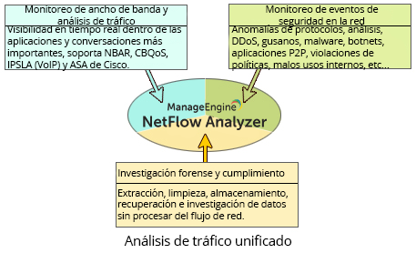 El monitoreo del ancho de banda y el análisis del tráfico y la seguridad de la red y la detección de anomalías de comportamiento son interdependientes y complementarias por naturaleza. NetFlow Analyzer, acoplado con ASAM, unifica estas soluciones complementarias para proporcionar un sistema de soporte de decisiones holístico y confiable en una sola interfaz amigable al usuario. Mientras que NetFlow Analyzer le permite visualizar el tráfico de red y el uso del ancho de banda a gran detalle, ASAM le ofrece un monitoreo continuo de la seguridad de red y capacidades de detección de anomalías.