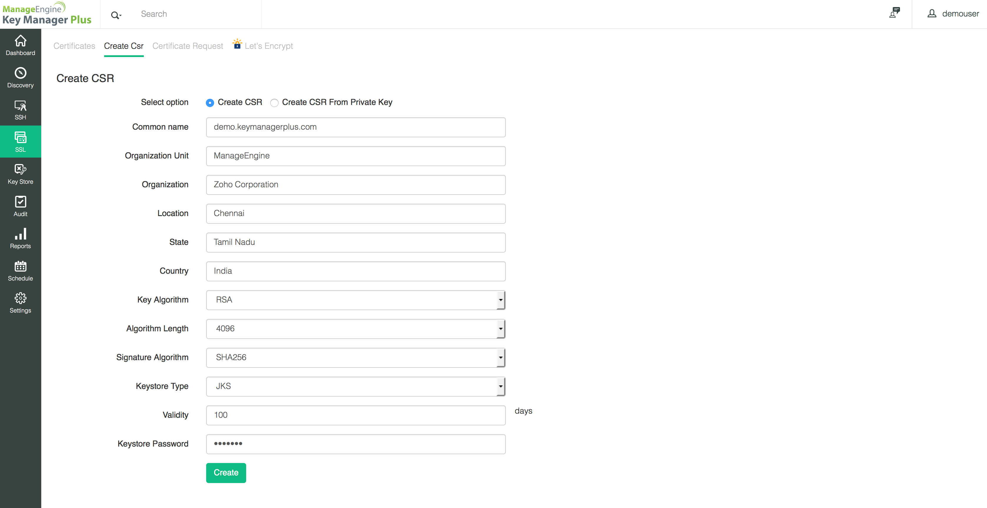 Key Manager Plus resuelve estos problemas centralizando el proceso de creación de certificados. Los certificados autofirmados y las CSR pueden generarse desde una cuenta central, en un solo paso, lo que reduce las molestias que conlleva la creación de certificados. Las claves privadas se generan simultáneamente durante la creación del certificado y no se almacenan por separado, por lo que no pueden replicarse. Además, centralizar el proceso ayuda a estandarizar el algoritmo hash, y se pueden utilizar claves robustas para cifrar todos los certificados. Así se garantiza la fiabilidad y seguridad de los certificados.
