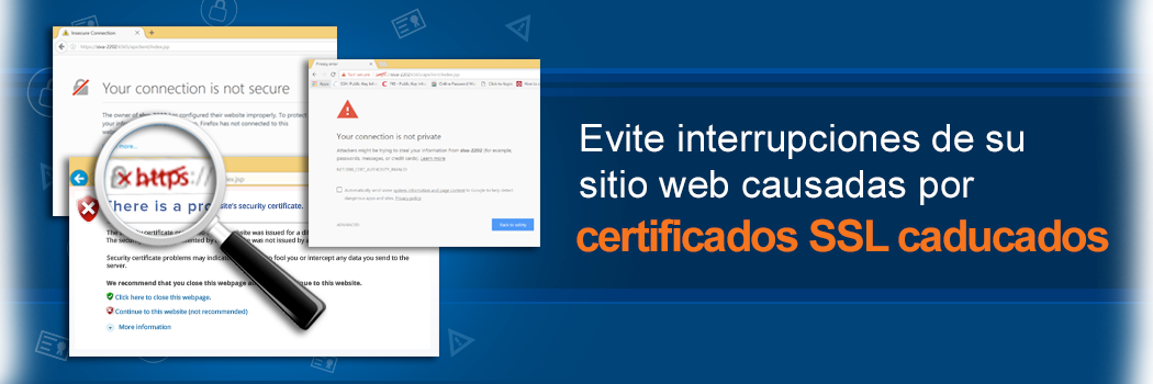 Al igual que un dominio caducado, los certificados SSL caducados también pueden causar interrupciones inesperadas. Los certificados SSL implementados en sus sitios web deben renovarse antes de su fecha de caducidad. Los certificados SSL caducados no sólo terminan impidiendo el acceso a sus sitios web, sino que también proyectan una mala imagen de su organización a los clientes. Los navegadores lanzan advertencias de seguridad que indican que no es seguro para los usuarios compartir datos privados con su organización, rompiendo su confianza en su organización.