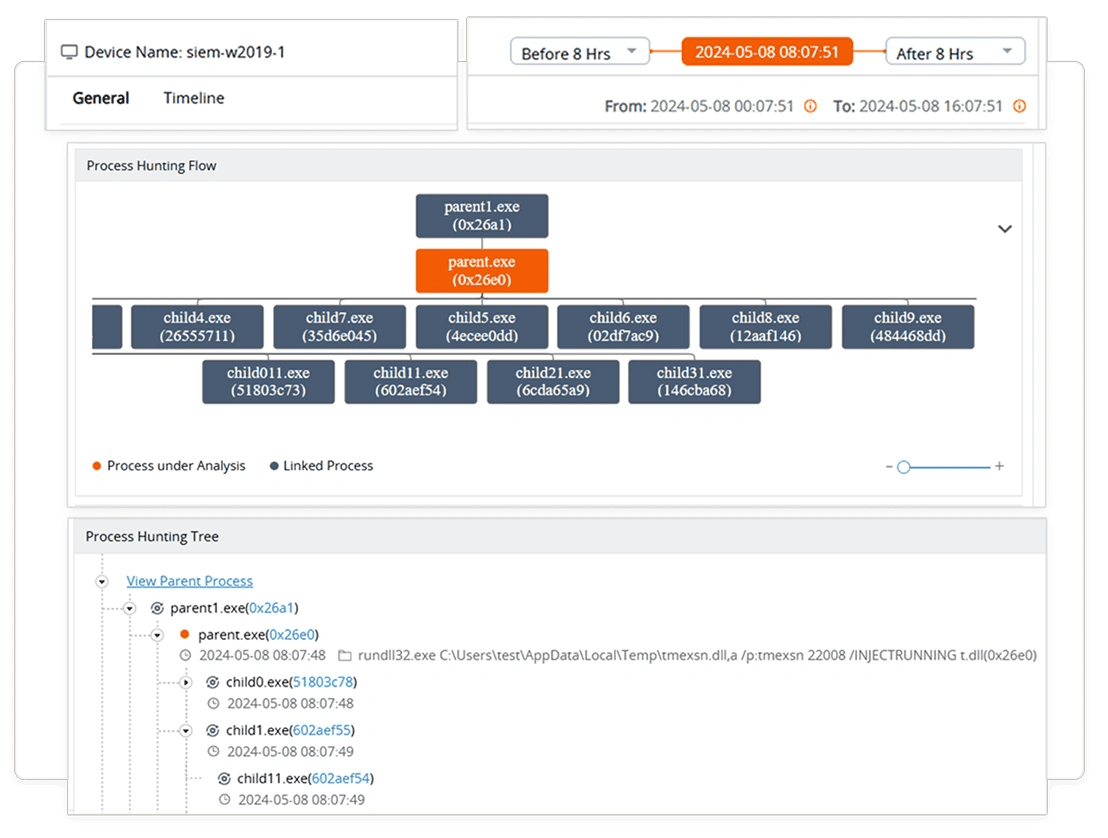 Log360 cuenta con un módulo de incidentes con capacidades avanzadas de búsqueda y análisis de procesos. Estas características permiten tener una mayor visibilidad sobre cómo se propaga un ataque y hasta dónde se comprometen los sistemas.