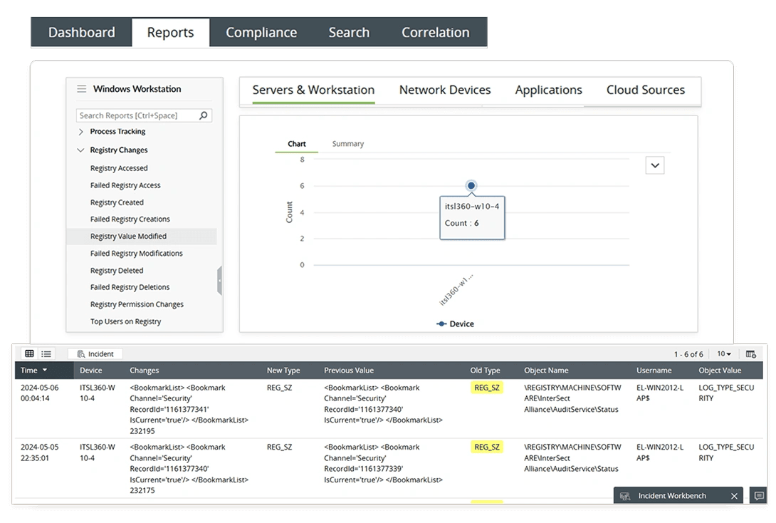 Por medio de reportes preconfigurados que rastrean accesos, creaciones, modificacione y eliminaciones, Log360 monitorea y detecta los cambios no autorizados en el registro de Windows de manera efectiva