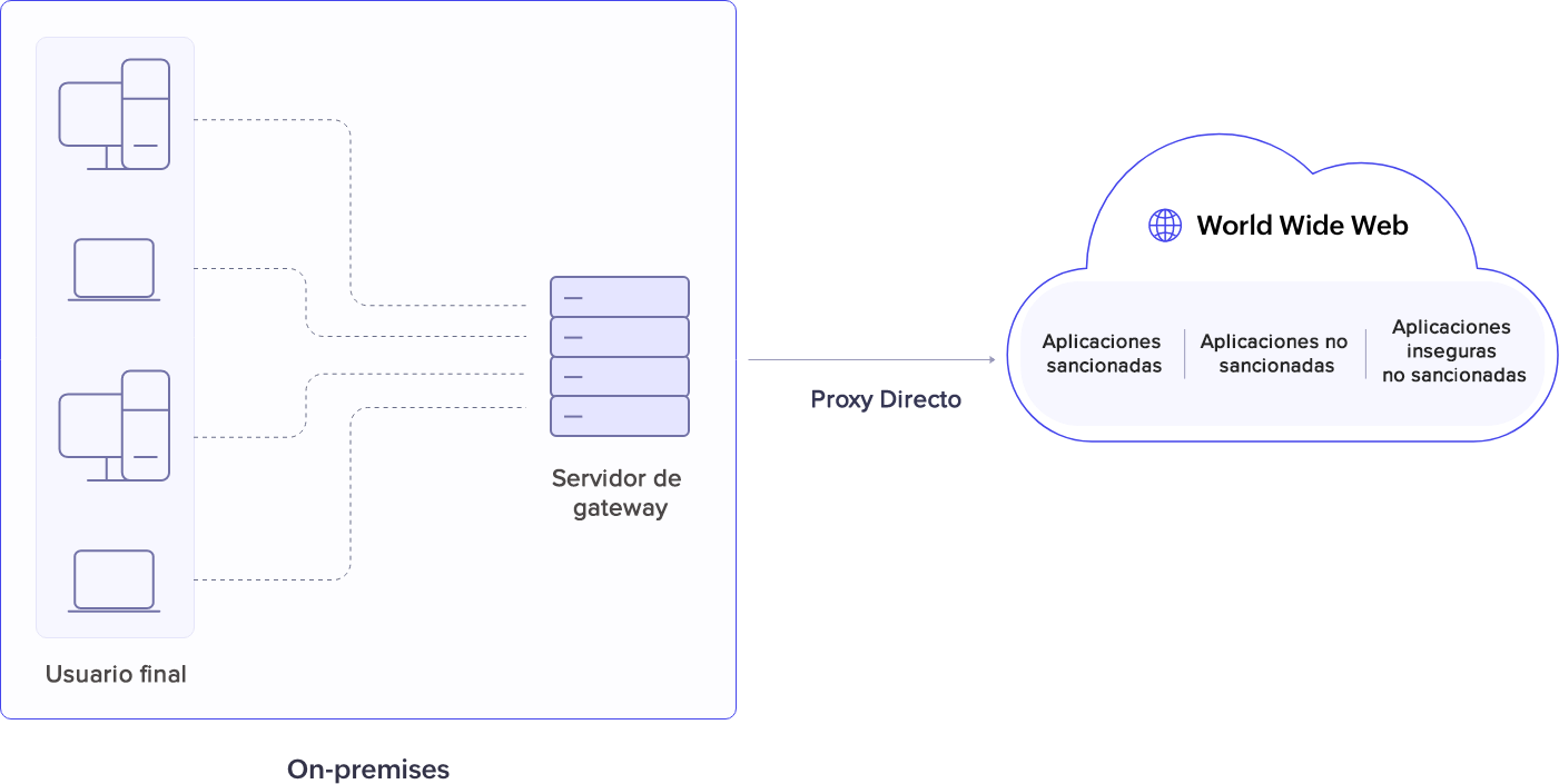La arquitectura del CASB de proxy directo se basa en un servidor de gateway situado en las instalaciones del cliente. Este servidor intercepta el tráfico saliente, realiza DPI para analizar los paquetes HTTPS, gestiona los certificados SSL/TLS para descifrarlos y volver a cifrarlos y aplica políticas de seguridad como el filtrado de URL, los controles de aplicaciones y DLP.