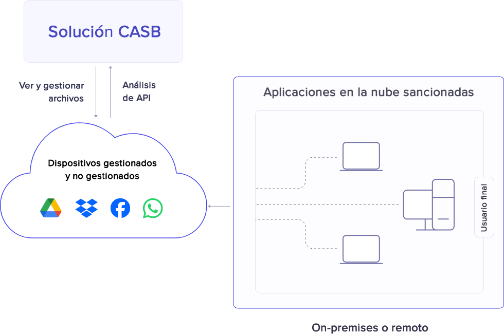 Un agente de seguridad de acceso a la nube o CASB es un software o solución de seguridad on-premises o alojado en la nube que actúa como guardián y monitorea la interacción entre los usuarios y las aplicaciones en la nube. Gartner® define los CASB como "puntos en donde se aplican políticas de seguridad on-premises o en la nube, situados entre los consumidores de servicios en la nube y los proveedores de servicios en la nube con el fin de combinar e interpolar las políticas de seguridad de la empresa a medida que se accede a los recursos basados en la nube".
