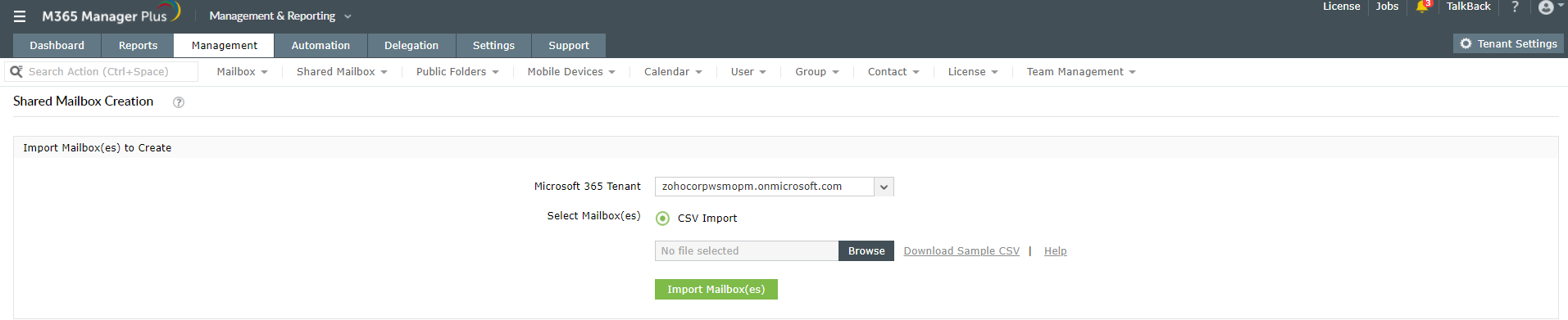 Con M365 Manager Plus, puede crear buzones compartidos para cada departamento existente de una sola vez y sin scripts de PowerShell. Cree un archivo CSV con la información necesaria y cárguelo en la página de creación de buzones compartidos de la herramienta (Gestión → Gestión de buzones compartidos → Creación de buzones compartidos). Una vez cargado el archivo CSV, M365 Manager Plus se encargará del resto.
