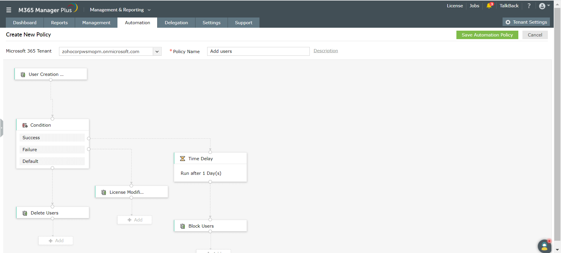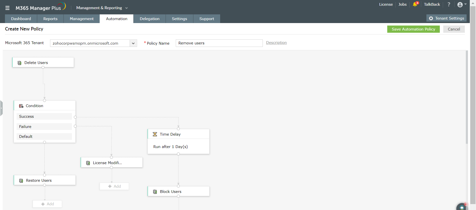 Demos un vistazo a algunas políticas de automatización de M365 Manager Plus: