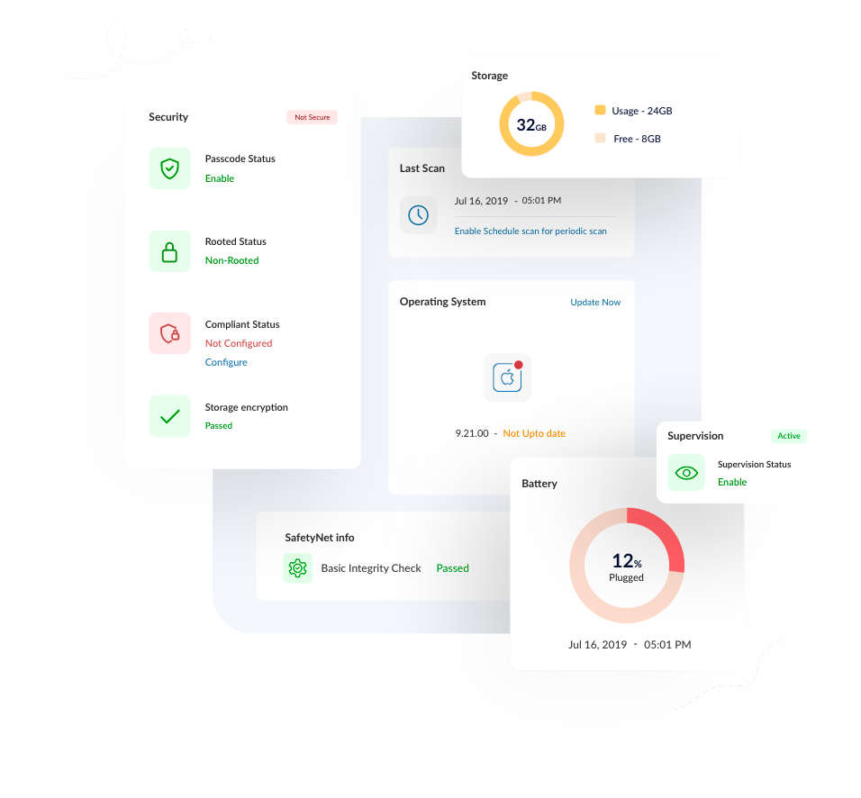 Obtenga información detallada del dispositivo sobre hardware, detalles de la red, aplicaciones, restricciones e historial de ubicación desde una sola ventana. Aplique medidas rápidas desde el mismo menú, como bloquear, supervisar y eliminar dispositivos.