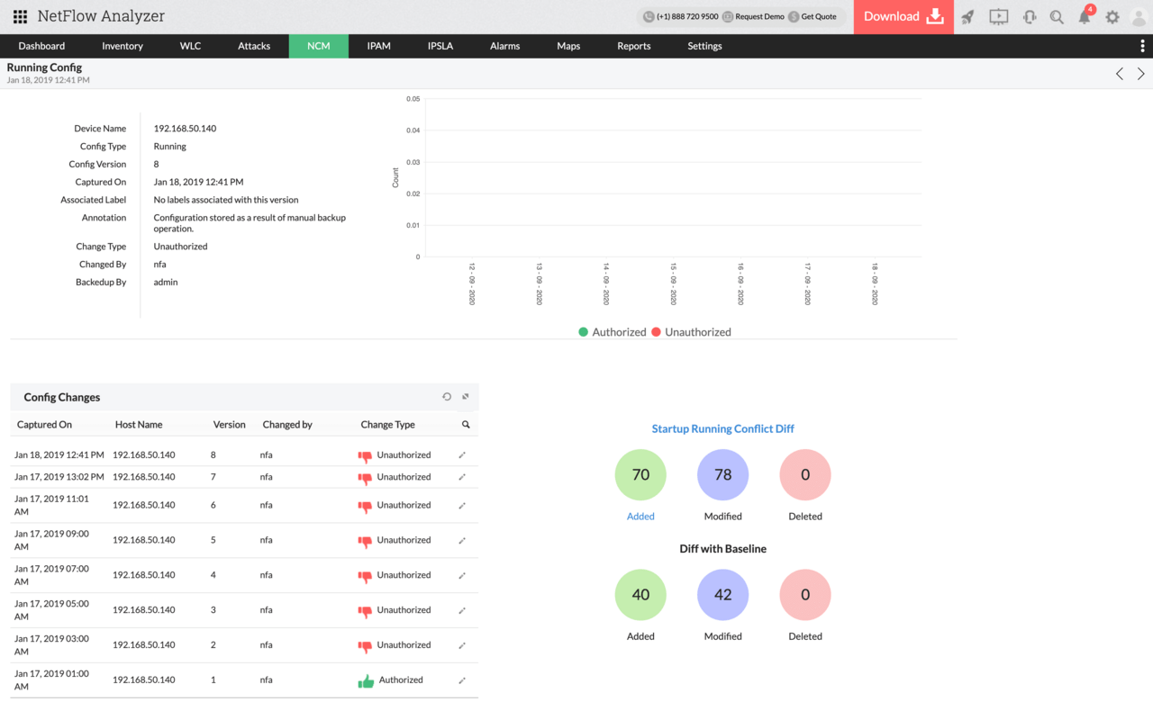 El add-on de NCM monitorea periódicamente las configuraciones en busca de cambios. Cualquier cambio hecho en una configuración existente, junto con la hora y fecha del cambio, se notifica inmediatamente por correo electrónico. También le permite realizar una auditoría sobre el cambio, como quién hizo qué y cuándo. Esto le ayuda a encontrar los errores en la configuración y actuar respectivamente.