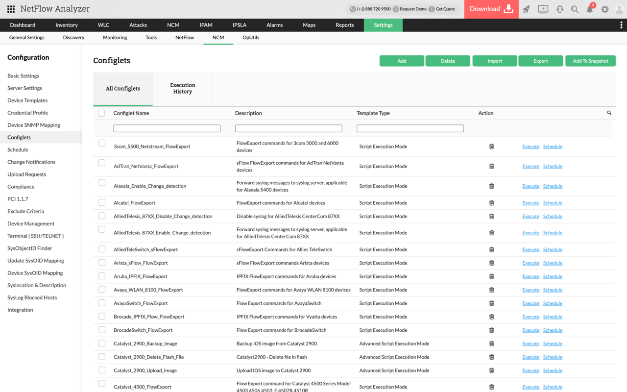 El add-on de Network Configuration Manager (NCM) ayuda a afinar y optimizar su red con base en la información de NetFlow Analyzer. Por último, usted puede monitorear y gestionar la salud de la red, y así automatizar las tareas de gestión de la configuración para eliminar el esfuerzo manual y ahorrar tiempo.