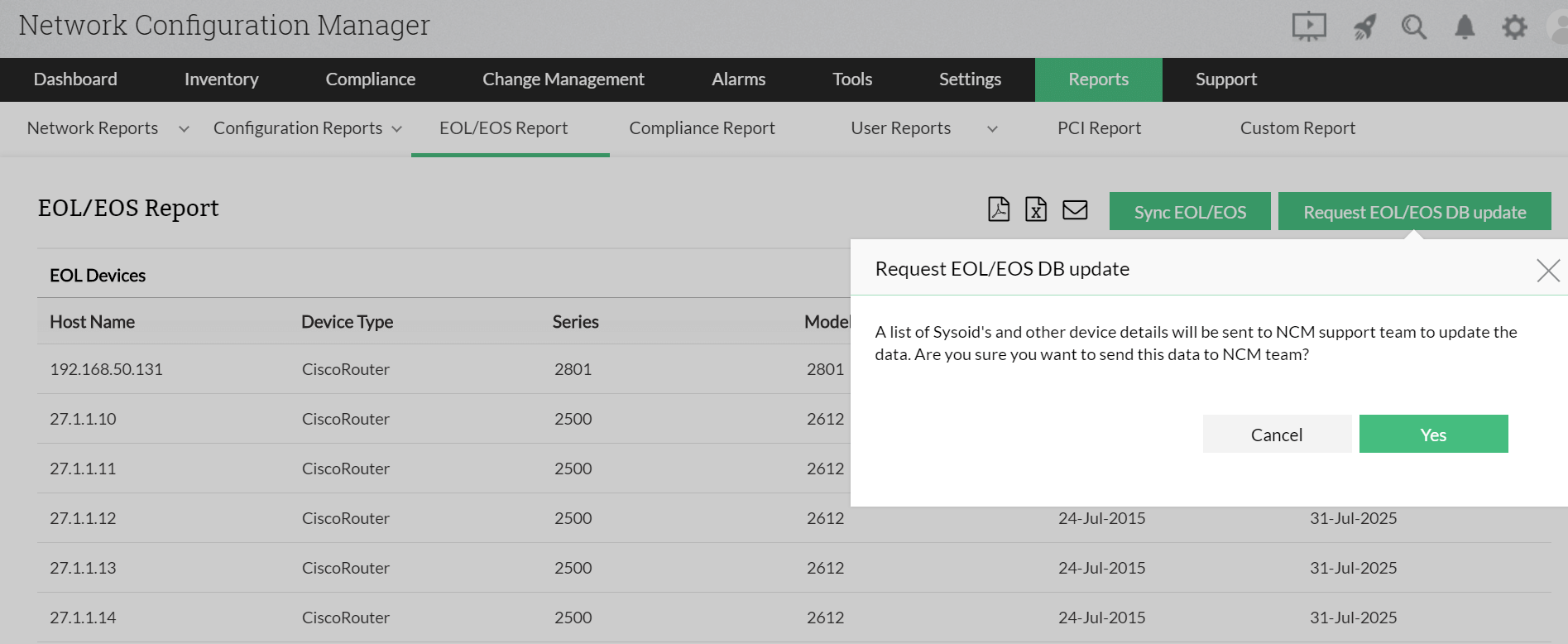 Algunas veces las fechas de EOL/EOS no están disponibles de manera predeterminada, lo que fuerza al administrador a buscarlas manualmente o contactar al proveedor. No obstante, hacerlo sería de hecho difícil cuando un administrador necesite información de EOL/EOS para muchos dispositivos. Network Configuration Manager facilita esto a los administradores con la opción de solicitar una actualización de la base de datos de EOL/EOS. Esta opción enviará una lista de las SysOID y otros detalles de los dispositivos a nuestro equipo de soporte, que luego usarán para llenar la base de datos con los correspondientes datos de dispositivos de red de EOL/EOS.