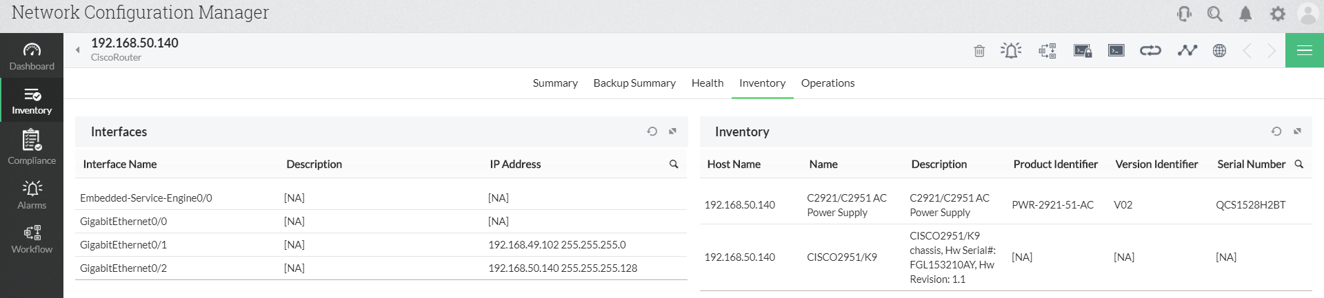 El inventario de hardware es la lista de dispositivos en un entorno junto con información detallada sobre las especificaciones de hardware. Para obtener esta información, el usuario / administrador debe iniciar sesión en el dispositivo y ejecutar el comando "Mostrar inventario". En respuesta al comando mostrar inventario, TELNET / putty muestra la información de hardware del dispositivo. Este proceso debe ejecutarse manualmente en cada dispositivo de su entorno, lo que puede resultar una tarea tediosa.