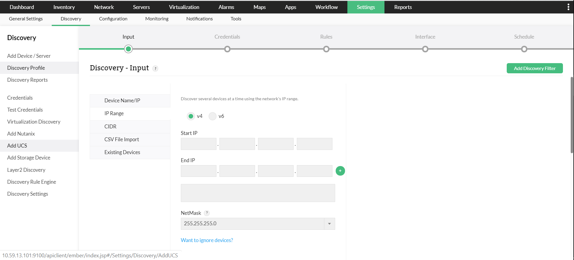 Descubrimiento: OpManager descubre todos los dispositivos presentes en una red mediante el escaneo automatizado de la red. El administrador de TI no está limitado a ningún protocolo específico, ya que OpManager descubre dispositivos que utilizan los protocolos SNMP (v1, v2 y v3), ICMP, WMI y Telnet.