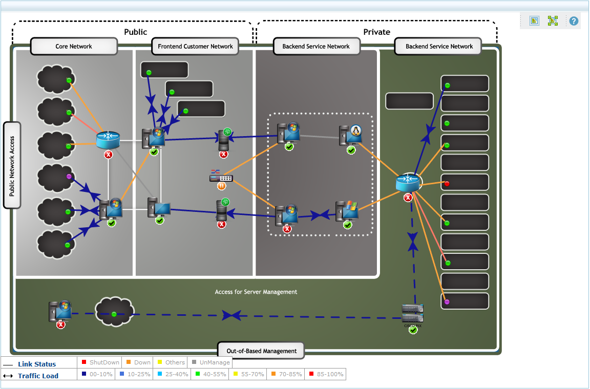 Además de lo arriba mencionado, usted puede agrupar dispositivos con base en el servicio corporativo que abordan, por ejemplo CRM, sistemas de procesamiento de orden y así. Esta vista de mapas es conveniente, sobre todo para un administrador, quien es responsable de garantizar la prestación de servicios corporativos críticos.