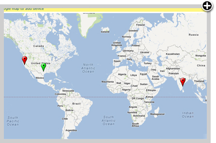 Al aprovechar el APIO Google Maps, usted puede colocar el dispositivo monitoreado exactamente en la ubicación (el ícono con forma de globo) Similar a otros mapas, los íconos propagan el estado del dispositivo. Esta vista de mapa es particularmente útil, cuando tiene grandes números de oficinas remotas distribuidas.